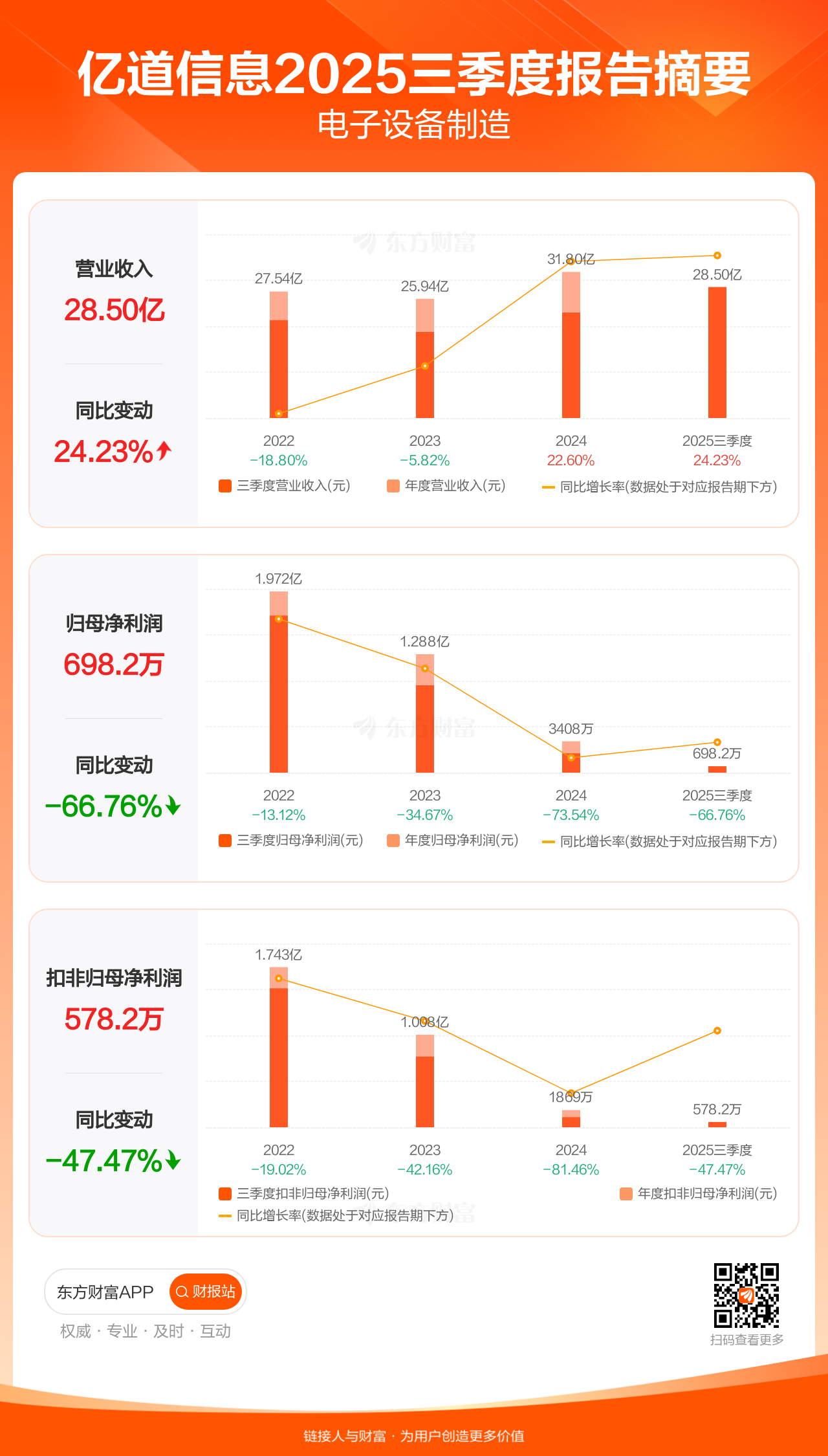 亿道信息10月29日发布2025年三季报显示,公司前三季实现营业收入28.50亿元,同比增长24.23%;归母净利润698.22万元,同比下滑66.76%;扣非归母净利润578.17万元,同比下滑47.47%。