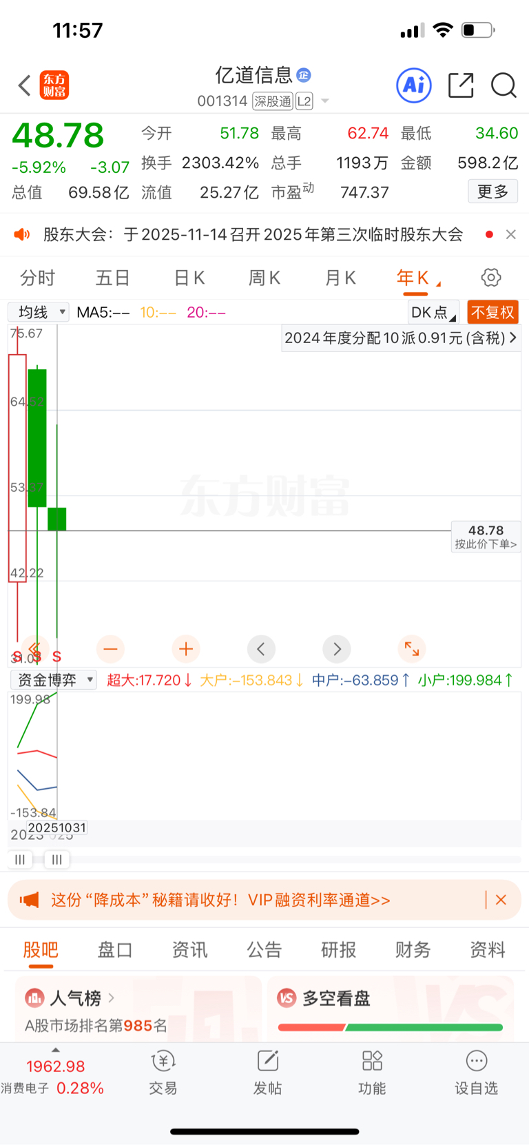 $亿道信息(SZ001314)$ 亿道信息的年线居然是绿的