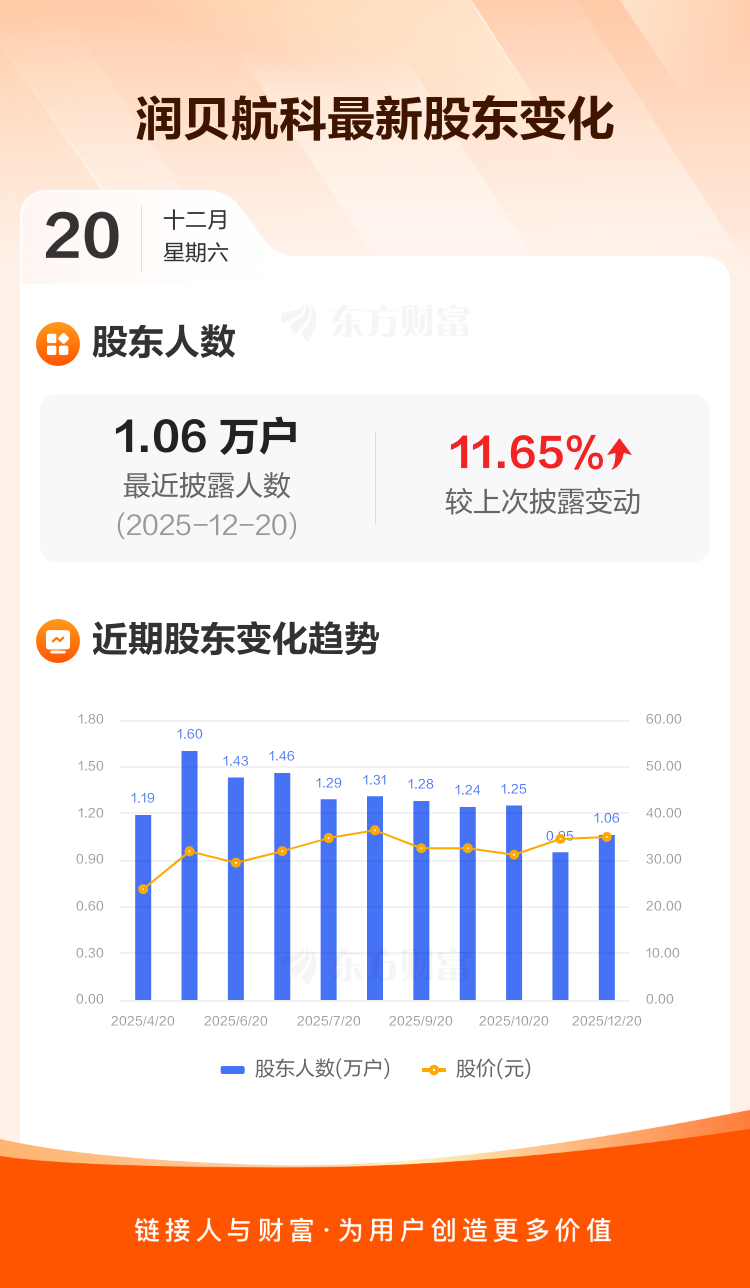 润贝航科最新披露数据显示,截至12月20日公司股东户数为1.06万户,较上期(2025年11月20日)增加1103户,增幅为11.65%。户均持有流通股数量由上期的1.18万股下降至1.05万股,户均持股金额由上期的40.63万元减少至36.77万元。