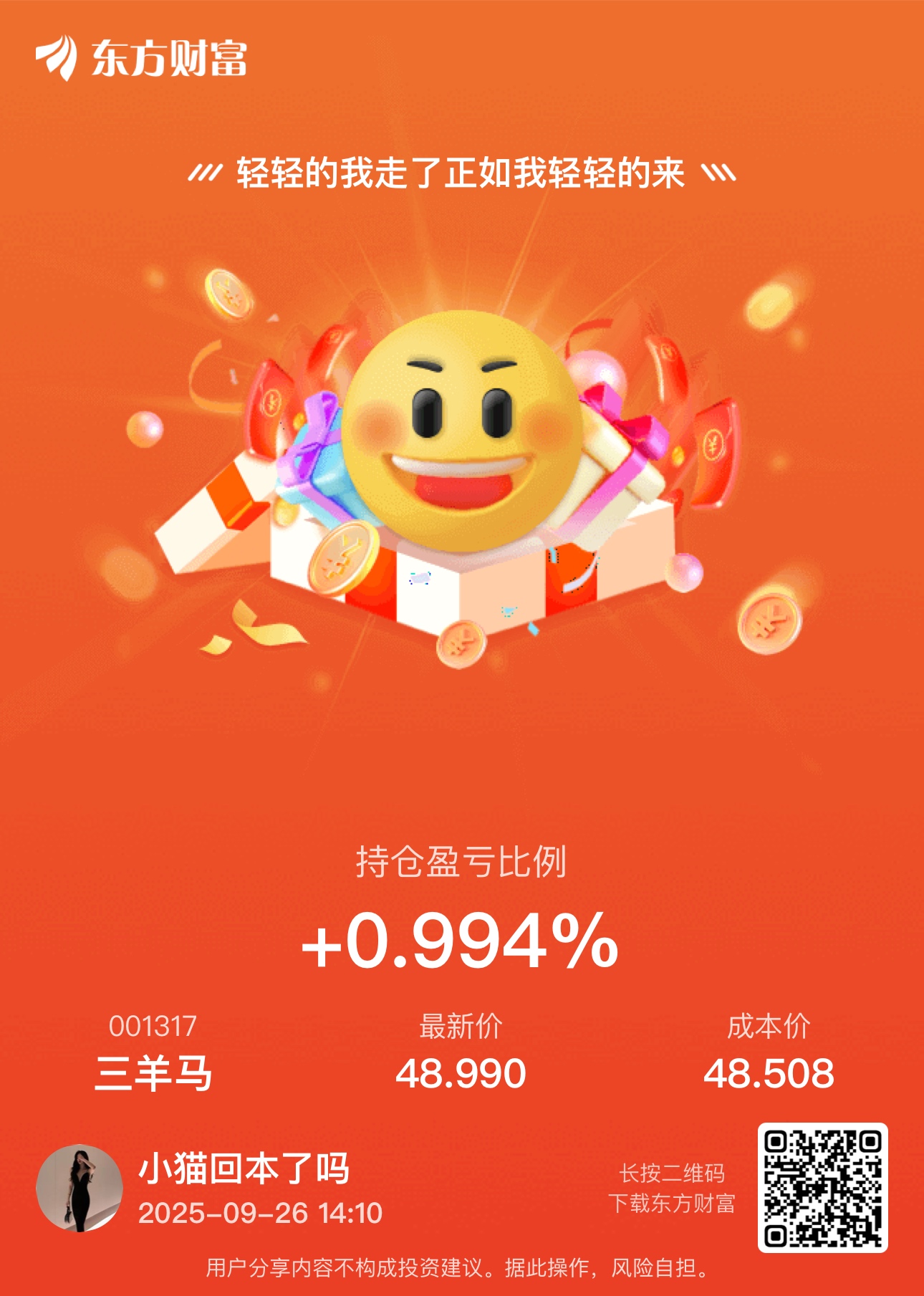 $三羊马(SZ001317)$ 今天买,等下或者下周t,早上还盈利两个点的,我真服了