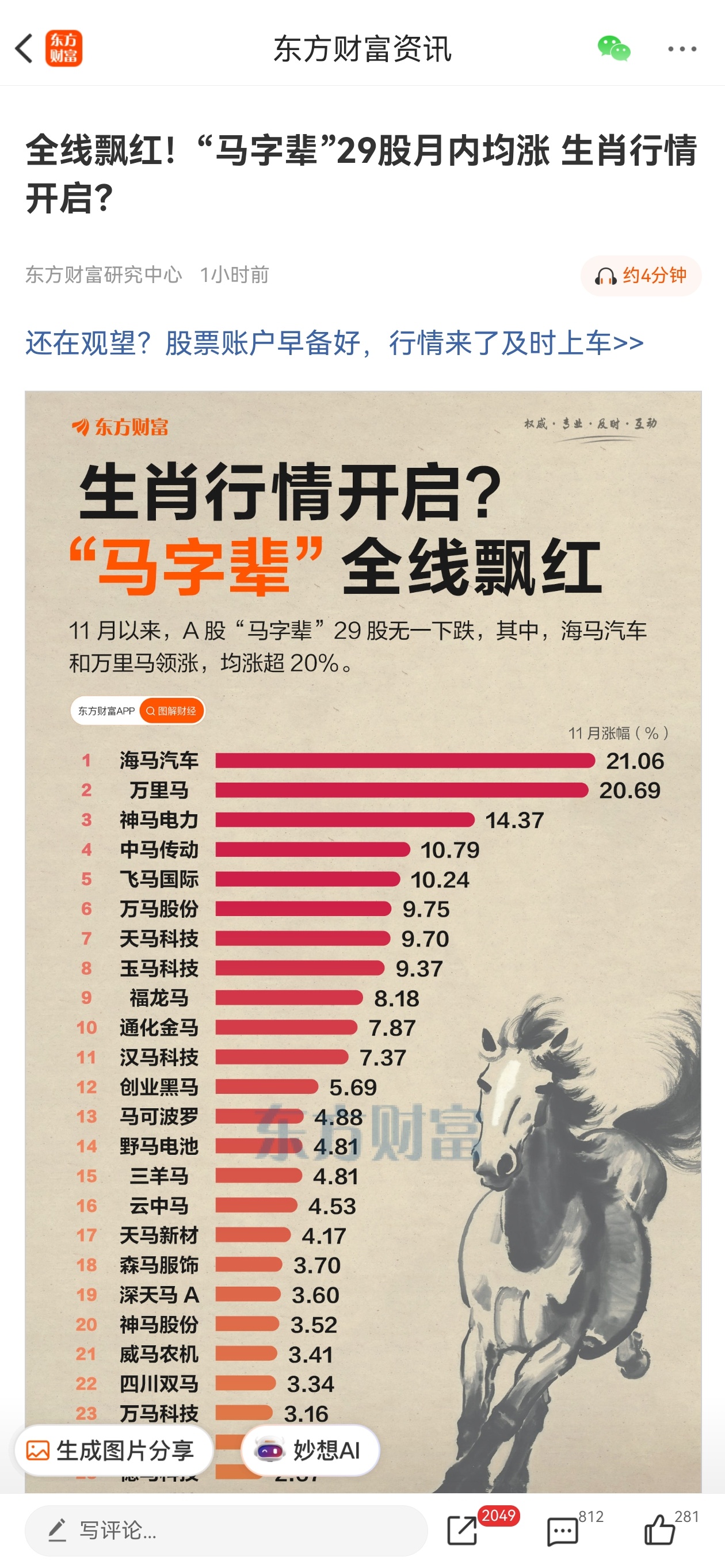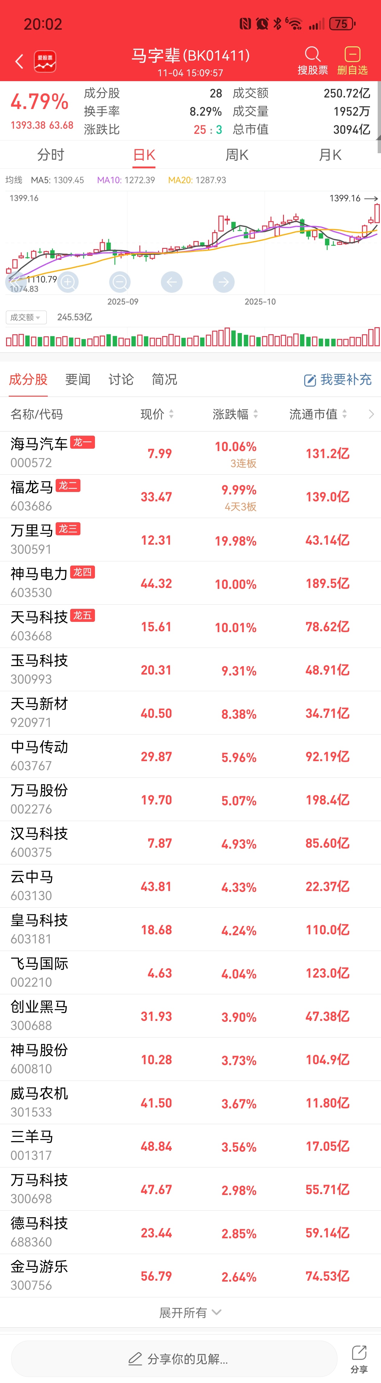 作为一个2月开始炒马,9月重仓至今获利颇丰的资深马票玩家,不管你愿不愿意听,当马字辈批量逆势上涨而且有5只或以上涨停龙虎榜霸屏,媒体开始大面积报道,散户群情激昂的时候,就该逐渐撤退甚至果断撤退了,如果还想玩,利润持股,莫追高,不然,解套可是下一个十二年,与诸位共勉! $三羊马(SZ001317)$ $汉马科技(SH600375)$ $万里马(SZ300591)$