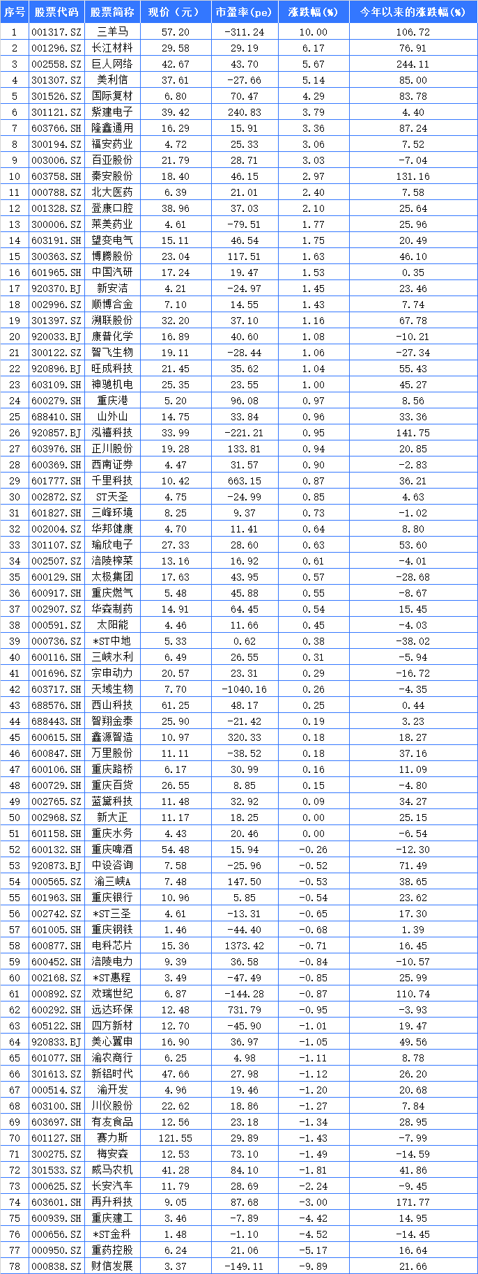 下跌渝股有27家,财信发展、重药控股和*ST金科分别以-9.89%(跌停)、-5.17%和-4.52%列涨幅最后三位。