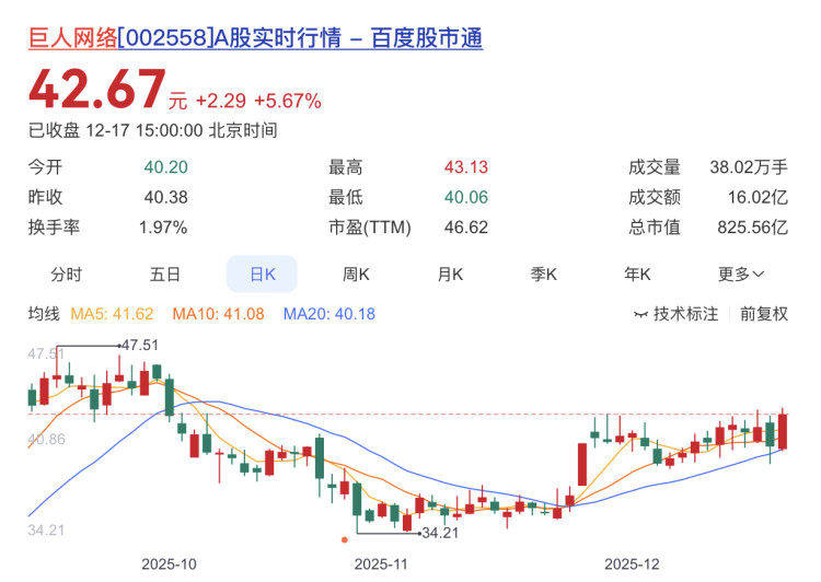 巨人网络报收42.67元,日涨幅5.67%,列第三,换手率1.97%,今年以来的涨幅为244.11%。