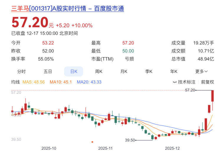 三羊马报收57.20元,日涨幅10.00%(涨停),位列第一,换手率55.05%,三连板,今年以来的涨幅为106.72%。