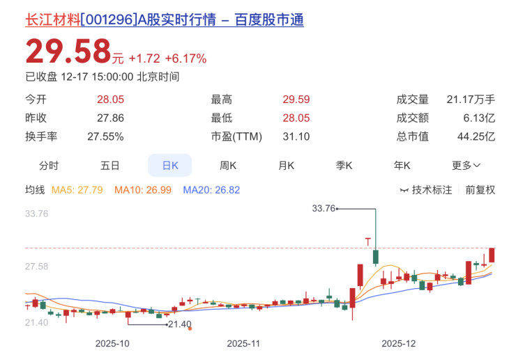 长江材料报收29.58元,日涨幅6.17%,列第二,换手率27.55%,今年以来的涨幅为76.91%。