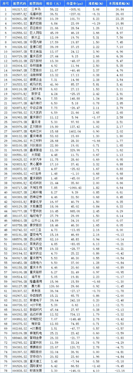 领涨的股票中,三羊马、泓禧科技和再升科技分别以涨幅30.84%、26.03%和23.25%,列重庆A股本周涨幅前三强。