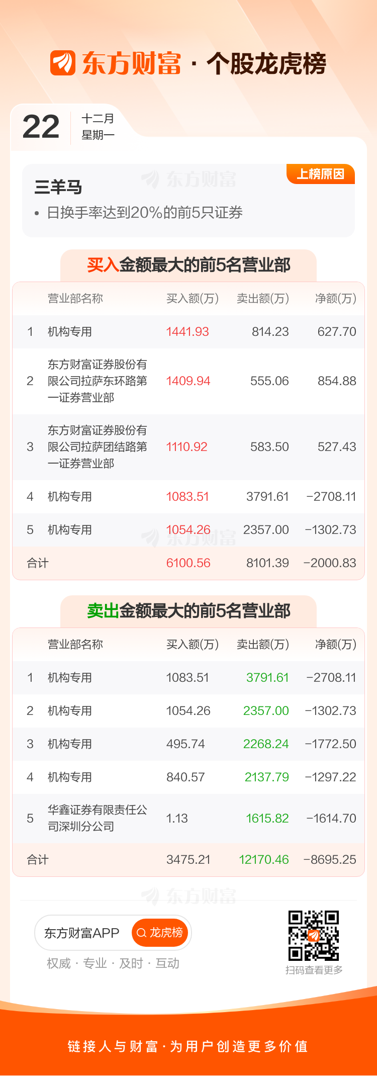 交易所2025年12月22日公布的交易公开信息显示,三羊马因成为日换手率达到20%的前5只证券上榜。三羊马当日收报58.07元,涨跌幅3.29%,偏离值48.75%,换手率48.75%,成交额9.84亿。