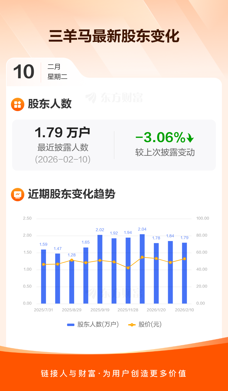 三羊马:截至2月10日最新股东户数1.79万户,较上期减少3.06%
