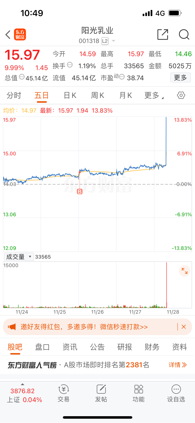 $阳光乳业(SZ001318)$ 什么情况,怎么突然涨停了