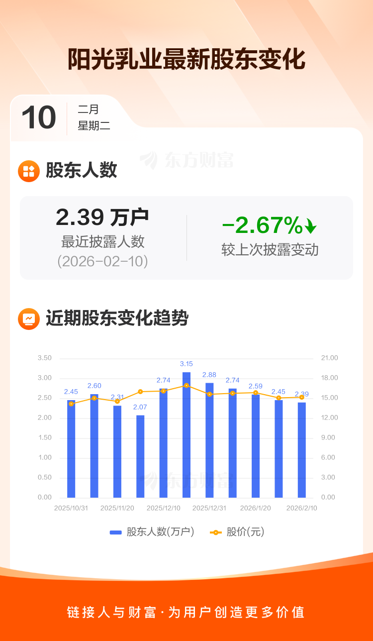阳光乳业:截至2月10日最新股东户数2.39万户,较上期减少2.67%