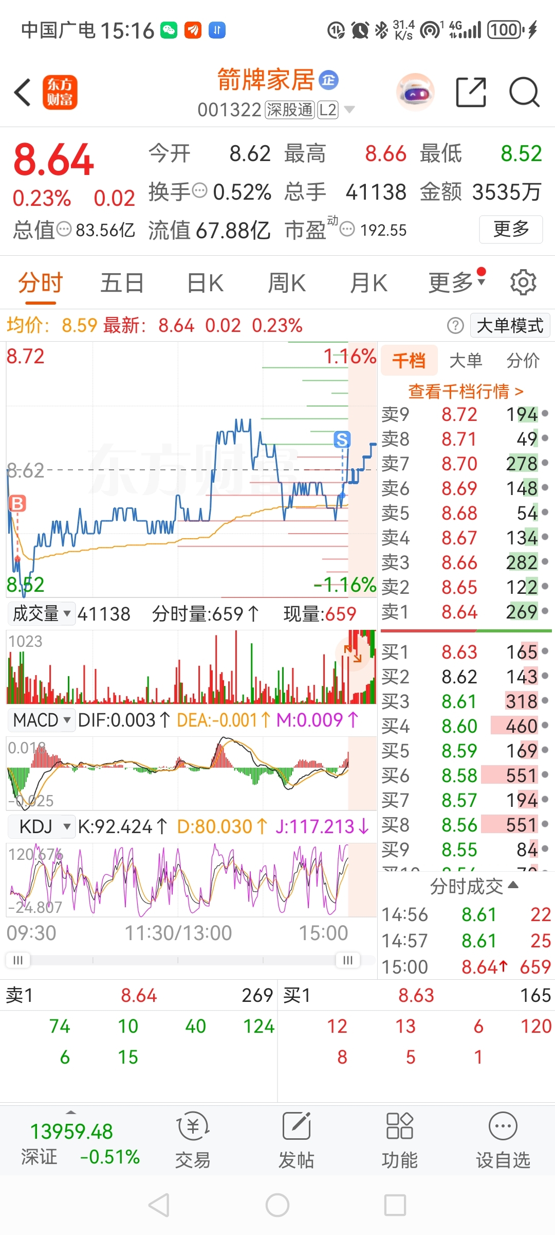 $箭牌家居(SZ001322)$ 赚个100块差价跑路,拉尾盘不放量,明天继续磕,明天目标8.45