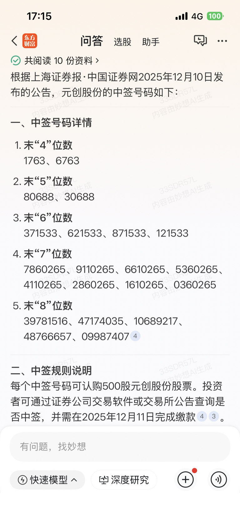 $元创股份(SZ001325)$ 东方财富已经给出中签号码了