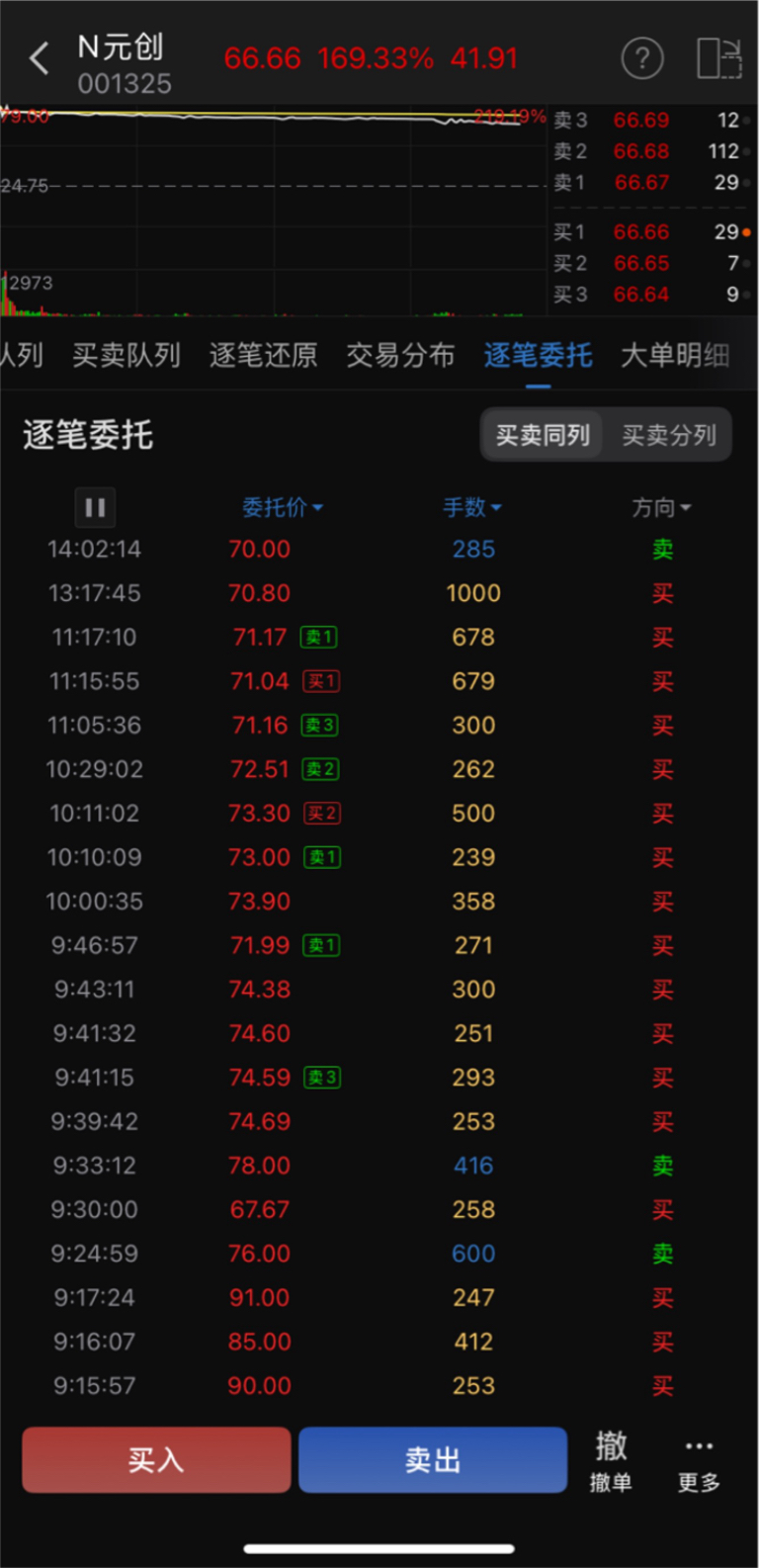 $N元创(SZ001325)$ 筛选的今天挂单,66元以上,200手以上的所有单子。
