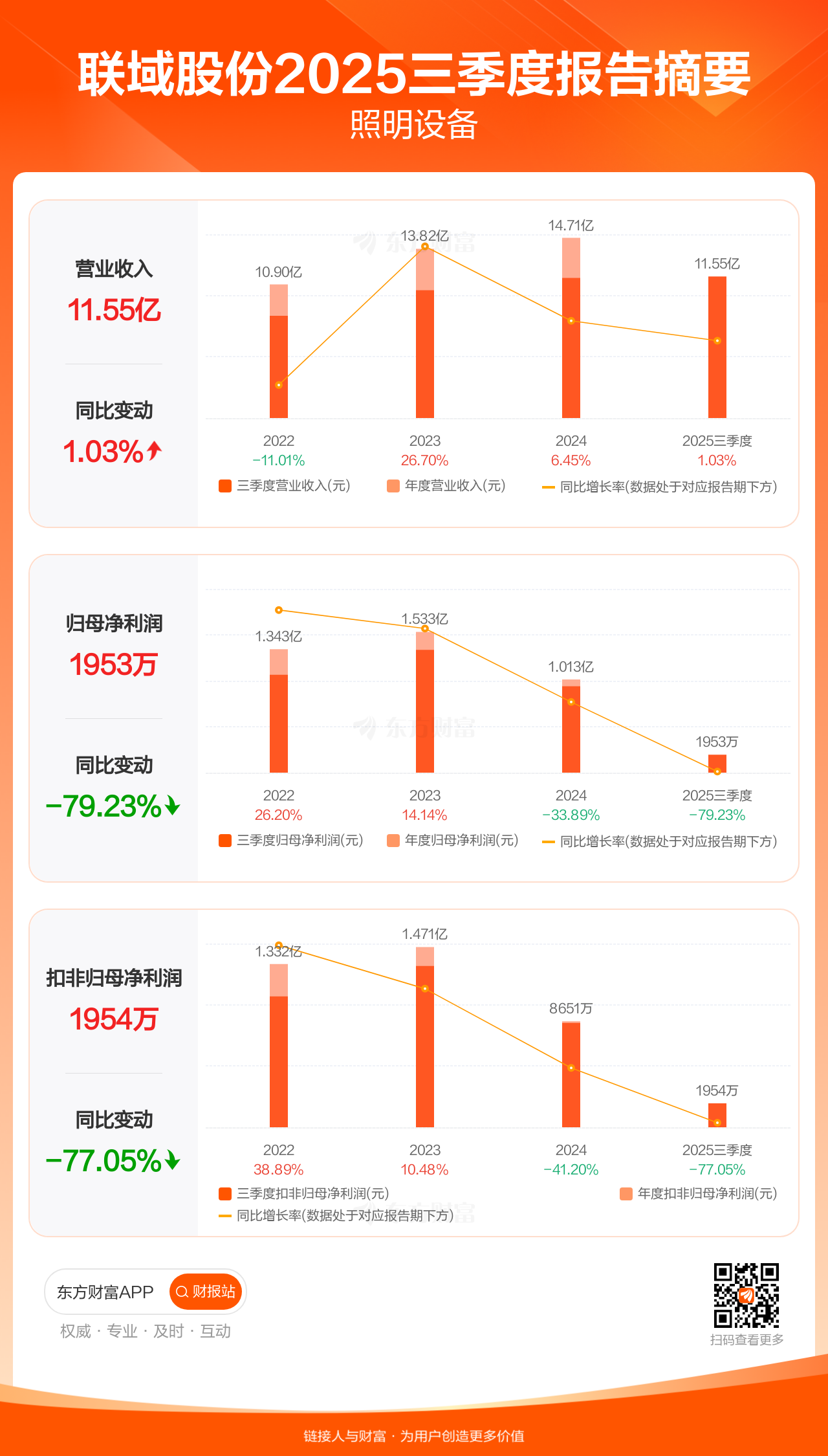 联域股份10月30日发布2025年三季报显示,公司前三季实现营业收入11.55亿元,同比增长1.03%;归母净利润1953.41万元,同比下滑79.23%;扣非归母净利润1953.85万元,同比下滑77.05%。