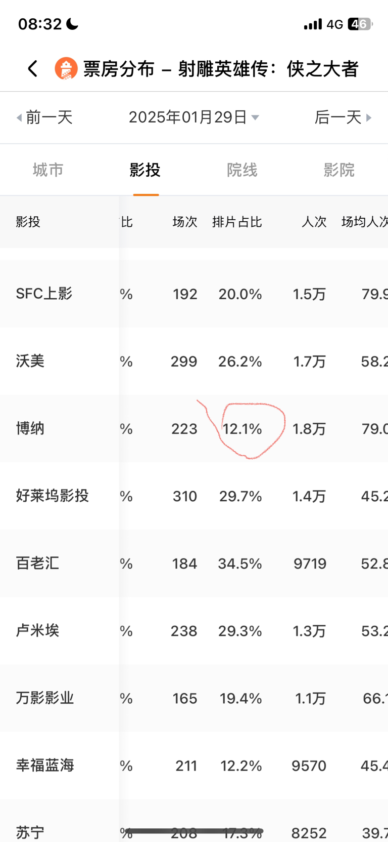 别的影院都在给射雕增加排片好赚一波博纳居然排片只有12%这是和钱有仇呢还是和谁有