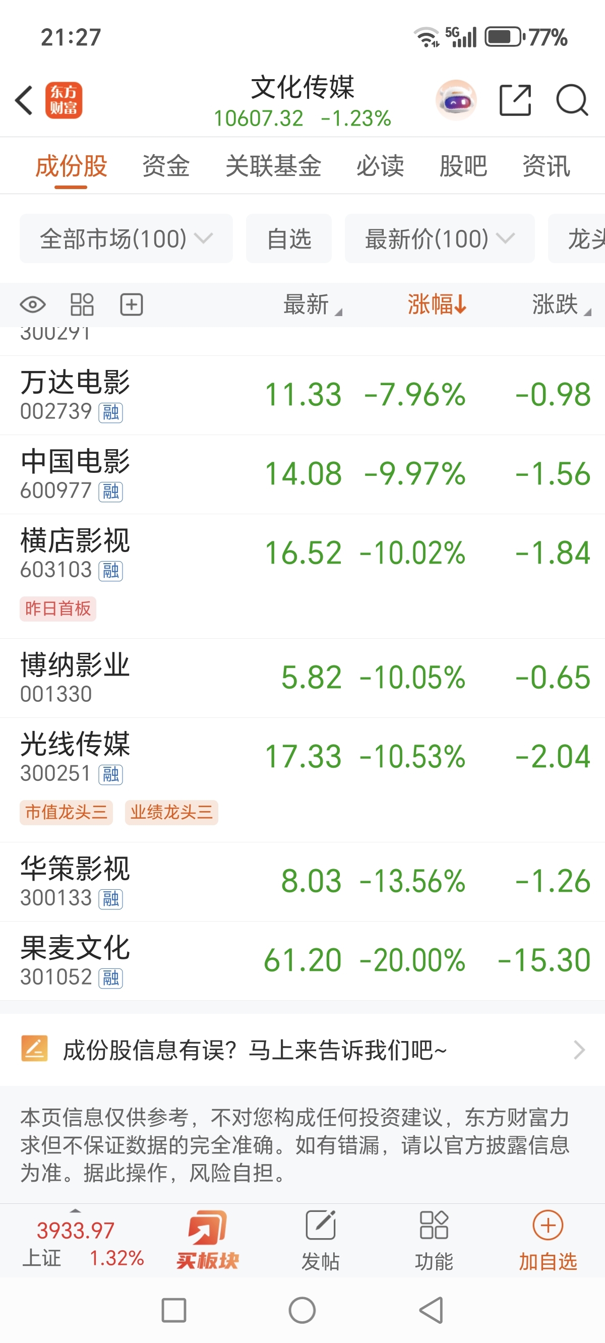 $博纳影业(SZ001330)$ $光线传媒(SZ300251)$ $果麦文化(SZ301052)$ 影视公司批量跌停,惨啊惨啊