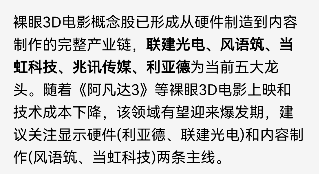 裸眼3D概念会随着阿凡达3的到来迎来一波炒作这部分概念股,炒作幅度会远比博纳影业