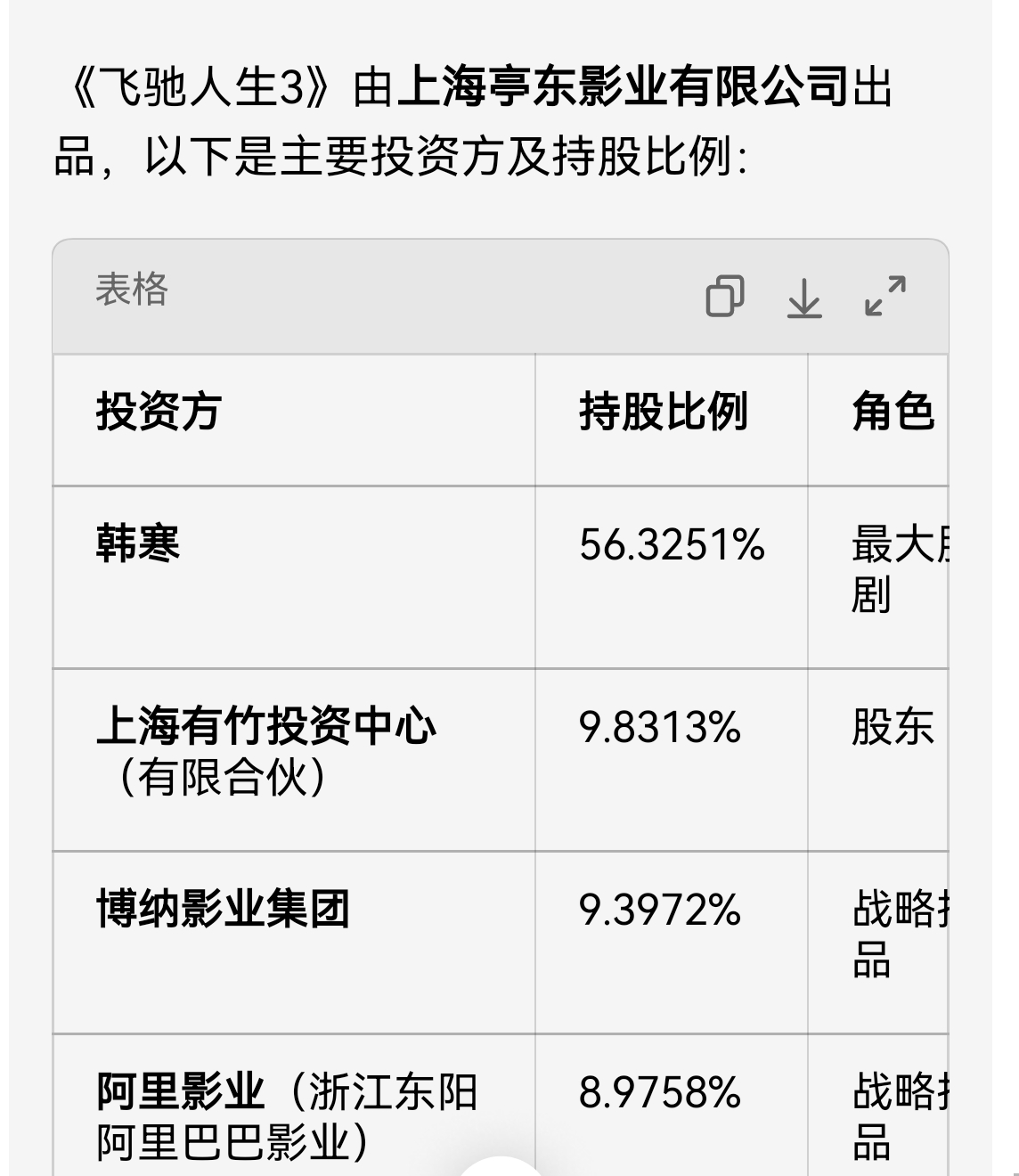 飞驰人生3说事,跟阿凡达3没有可比性。博纳影业在飞驰人生投资不到10%即使票房创