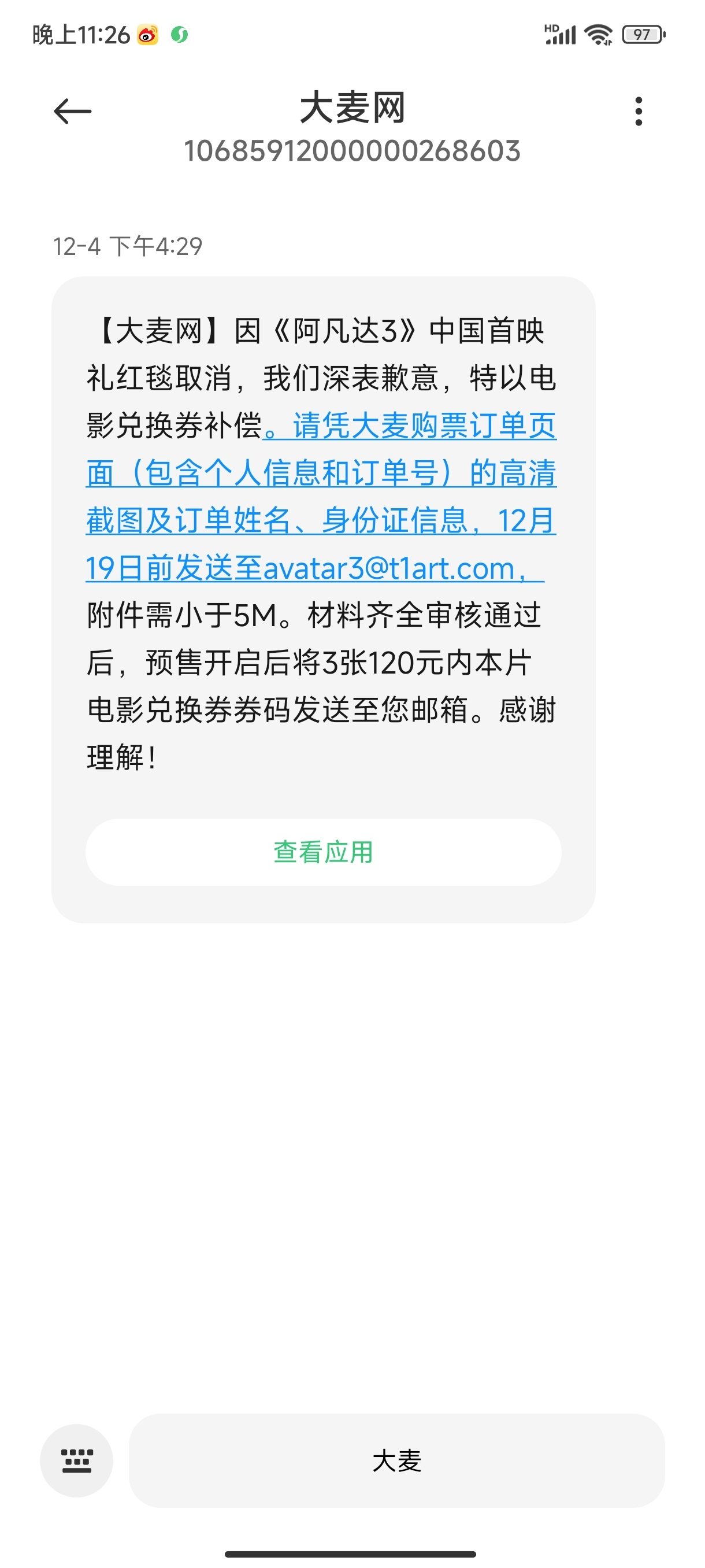 卡神12月8号就要来三亚红树林参加阿凡达3首映礼,大麦补了3张120的代金券给我