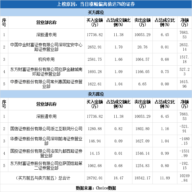 今日龙虎榜单上出现了深股通的身影,占据了买一、卖一的位置,净买入7683.53万元,占当日成交总额的4.93%。除此之外深股通还参与到了天孚通信、荣科科技、国际复材等12只个股中,其中9家呈现深股通净买入,获净买入最多的是天孚通信,净买额为25.75亿元;3家呈现深股通净卖出,遭净卖出最高的为雪人集团,净卖额为2280.64万元。