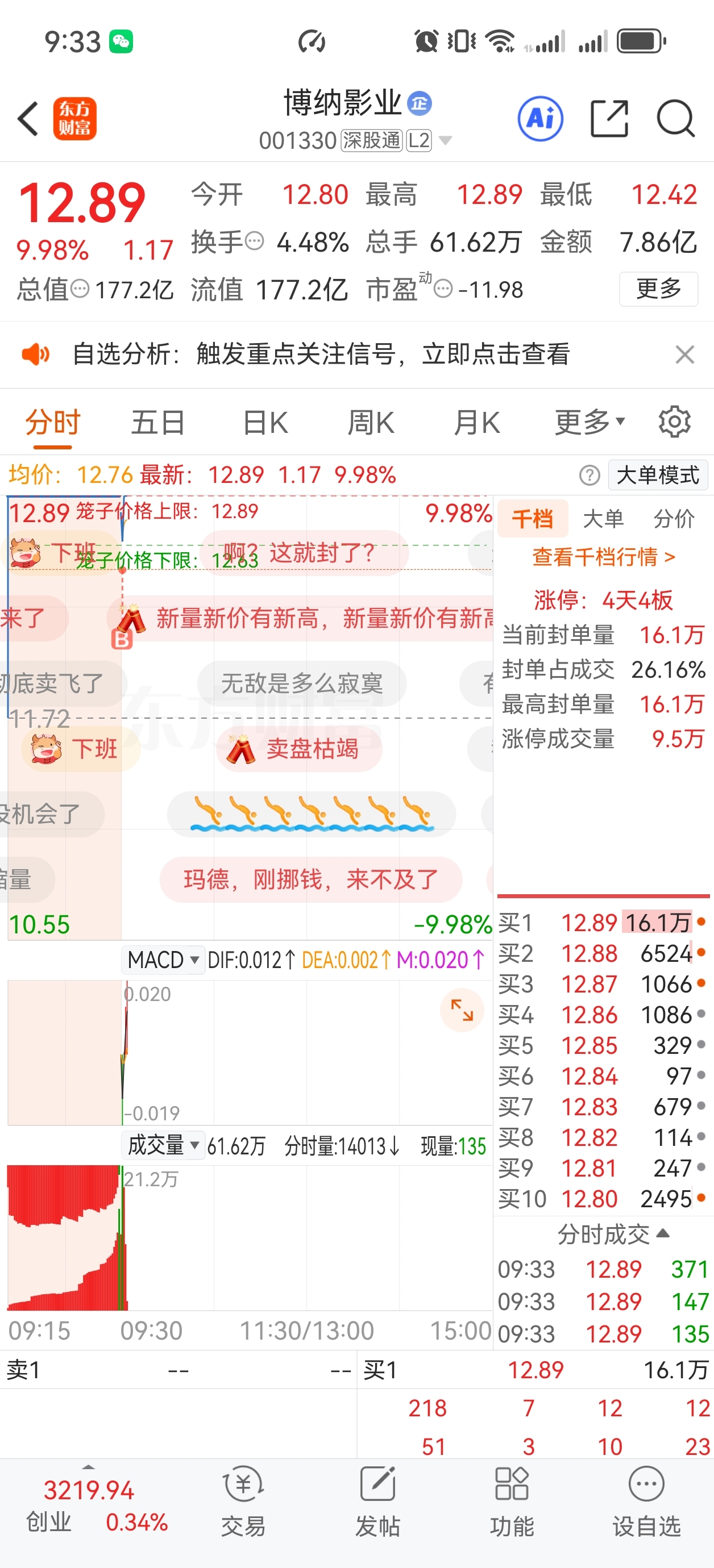$博纳影业(SZ001330)$ 封紧封紧,虚空买点,12.5小仓位参与下