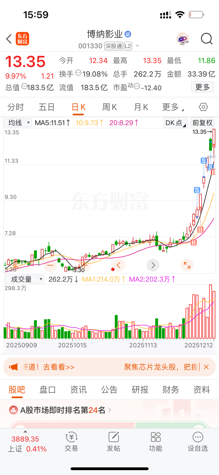 $博纳影业(SZ001330)$ 今早11.90买回来!
