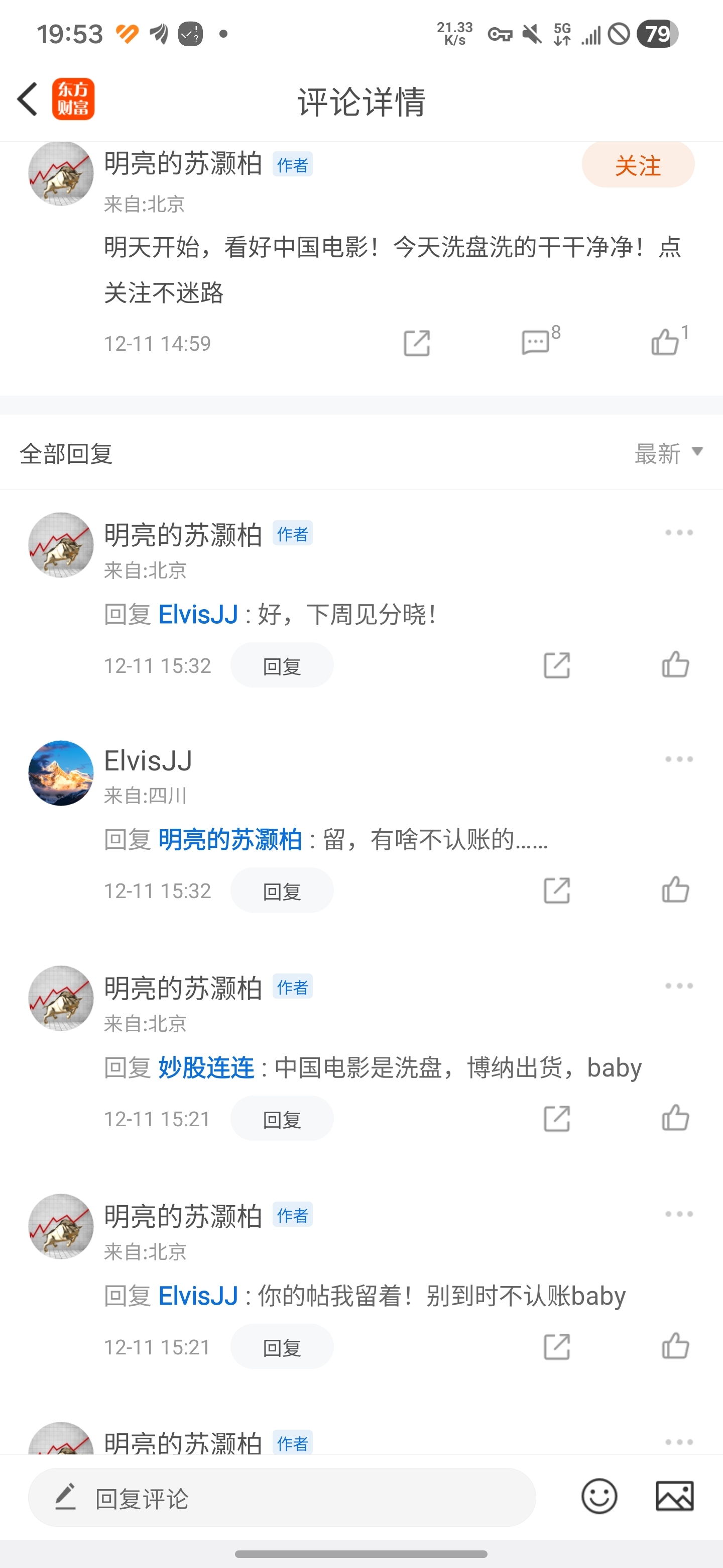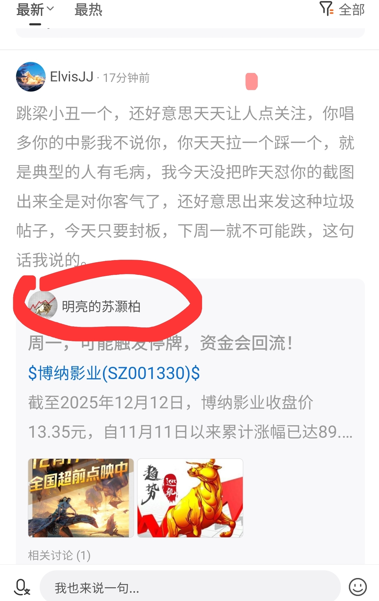 $博纳影业(SZ001330)$ 这人拉黑我还在我帖子下面继续表演,这种股吧装模作样的“伪专业”就该喷,回复我一条就把我拉黑了,说我粉丝少,你是抽不到膜到了吗,有家人加我我能控制?跳梁小丑就得给你挂上。