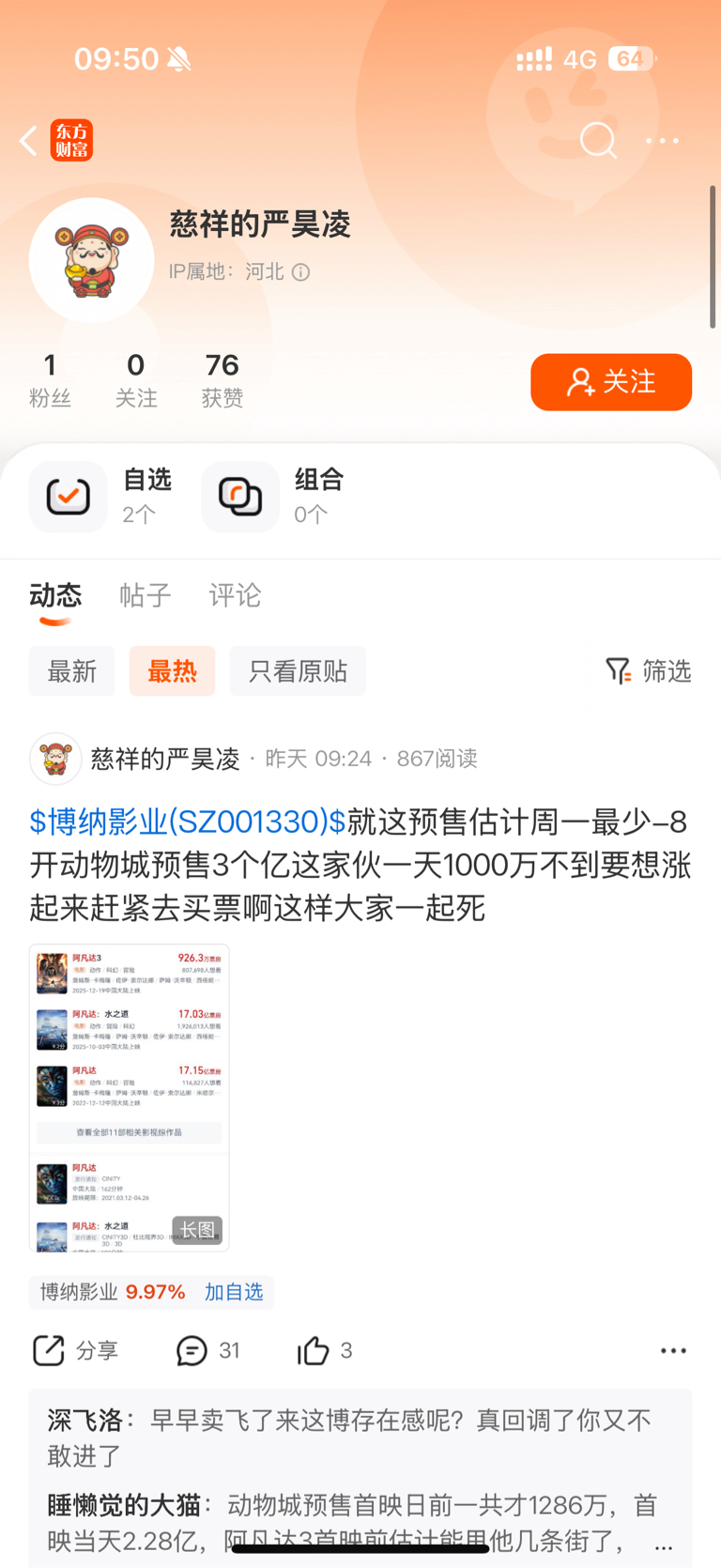 $博纳影业(SZ001330)$ 我一个人朋友认识他,说他炒股妻离子散了,精神有点问题,看不得个股一直涨。所以大家还是原谅他吧,毕竟跟一个精神有问题的人争,也会过意不去。赚亏都好,大家开开心心的。