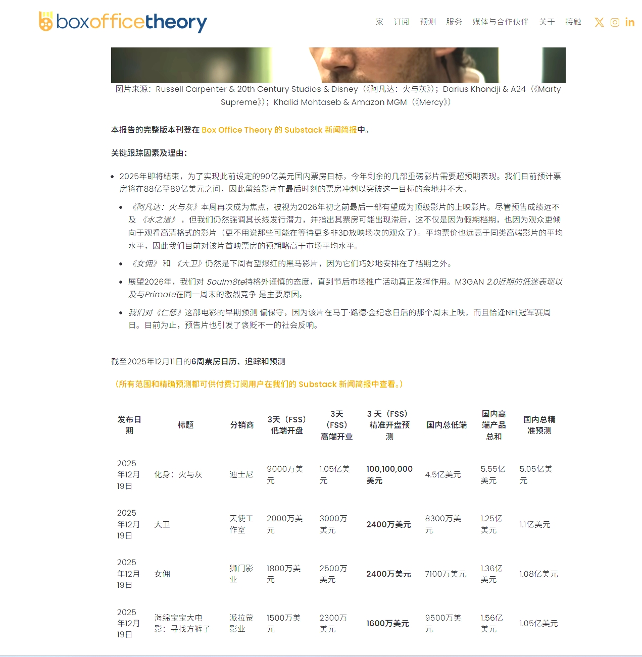 这两天大家讨论最多的莫过于阿凡达第三部票房的预测,博主作为17年外贸从业人员雅思7.5分托福105分,更是高命中率职业打板手,可以很负责任的告诉大家,阿凡达3这部电影我们需要把重点精力放在北美市场,虽然目前预售速度没有第二部那么亮眼,但是如果北美市场首个周末票房超过1亿美金就算成功,这种大型的电影也需要看后劲,如果后劲很足的话可能会爆发,我刚刚看了一下国内的预售成绩,目前已经1715万了,北美专业票房预测网站boxofficetheory票房理论预测首周末北美票房1.001亿美金,而boxofficepro预测首个周末票房介于1.35至1.65亿美元。