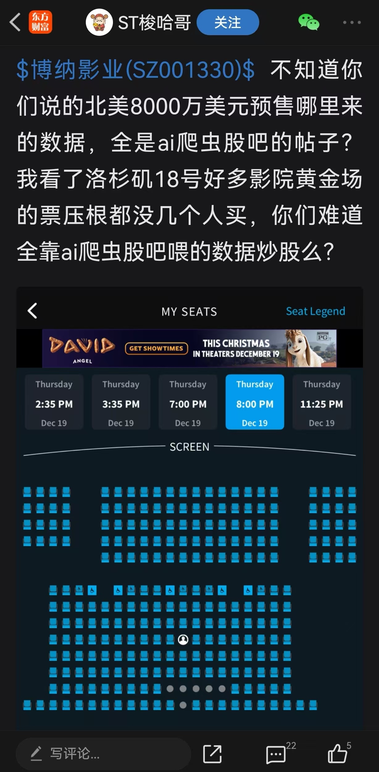 $博纳影业(SZ001330)$ 大家一起举报,此人昨天说纽约最繁华地方的黄金时间都没票房,今天把那个帖子删了又继续造谣洛杉矶黄金场没人买,他P的图上哪一点是阿凡达3,一帮人唱空国内票房还不过瘾,又来唱空国外票房,其心可诛… 所有像失心疯唱空的都无感,只觉得好好笑,但这个造谣国外的太恶心了