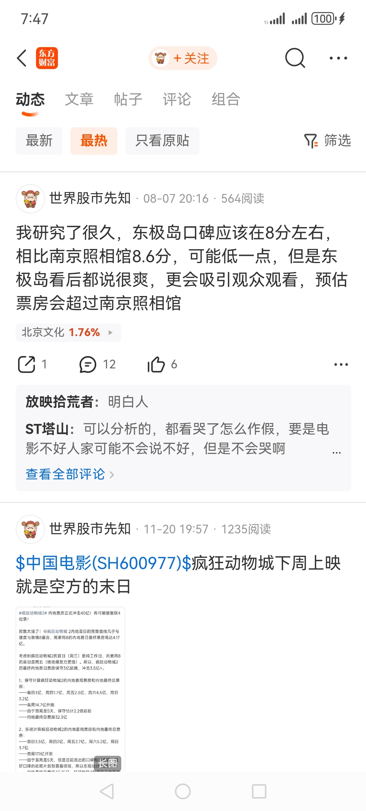 好家伙,这个叫(世界股市先知)的家伙买了北京文化和中国电影,跑这刷了两天两夜了,