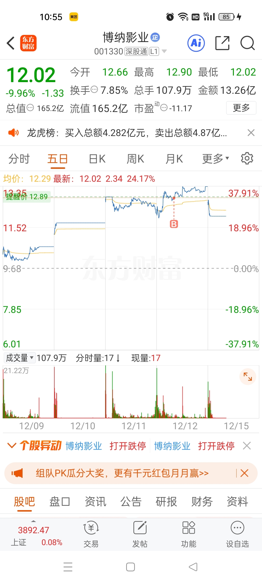 $博纳影业(SZ001330)$ 涨停没溢价还直接跌停,玩不好了