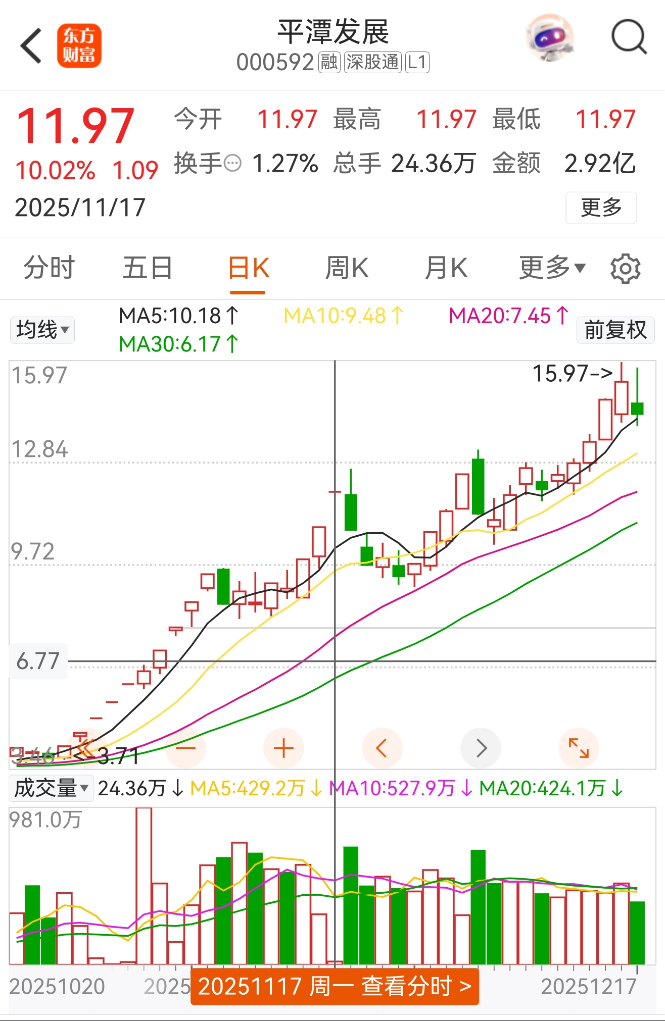 平潭发展涨一波后,11月17日涨停后也是两个地板,然后继续走……怕什么!
