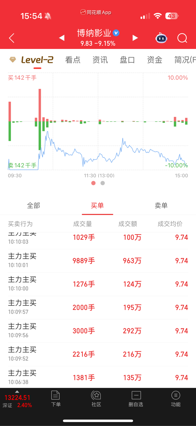 $博纳影业(SZ001330)$ 散户真猛啊。一个9889手点火就都上了。一万手点火吸引20万手散单跟风。散户最爱的就是地板翘板和高位接盘。说句实话看看海王 都A杀了。这还有啥预期。说什么票房反转 这个位置了都是筹码博弈了你还在找利好安慰。这个位置就算有个反抽板也是离场机会了。你能抓住了性价比太低#收盘点评# #复盘记录#