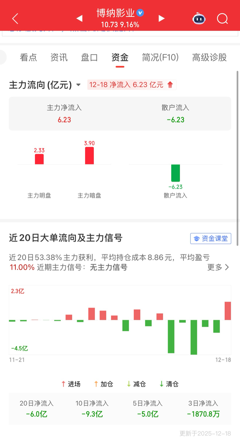 $博纳影业(SZ001330)$ 今天进来6个多亿了!!后续能回去13吗