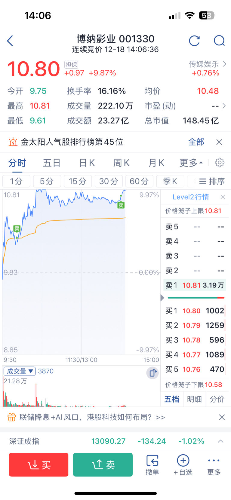 $博纳影业(SZ001330)$ 一手不够,再来一手,不信顶不上去
