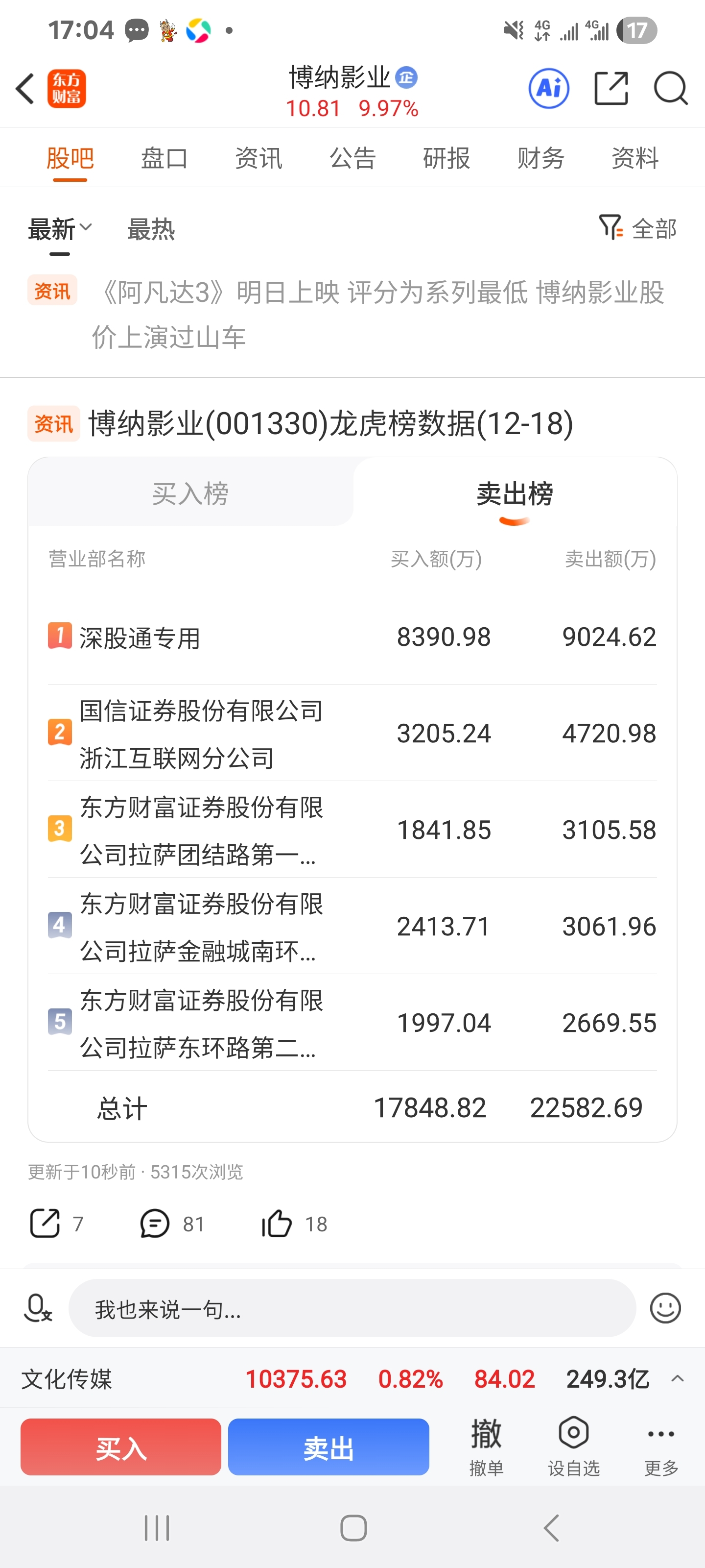 $博纳影业(SZ001330)$ 这卖榜我看了都想笑,家人是不是都T飞了,T飞了吱一声