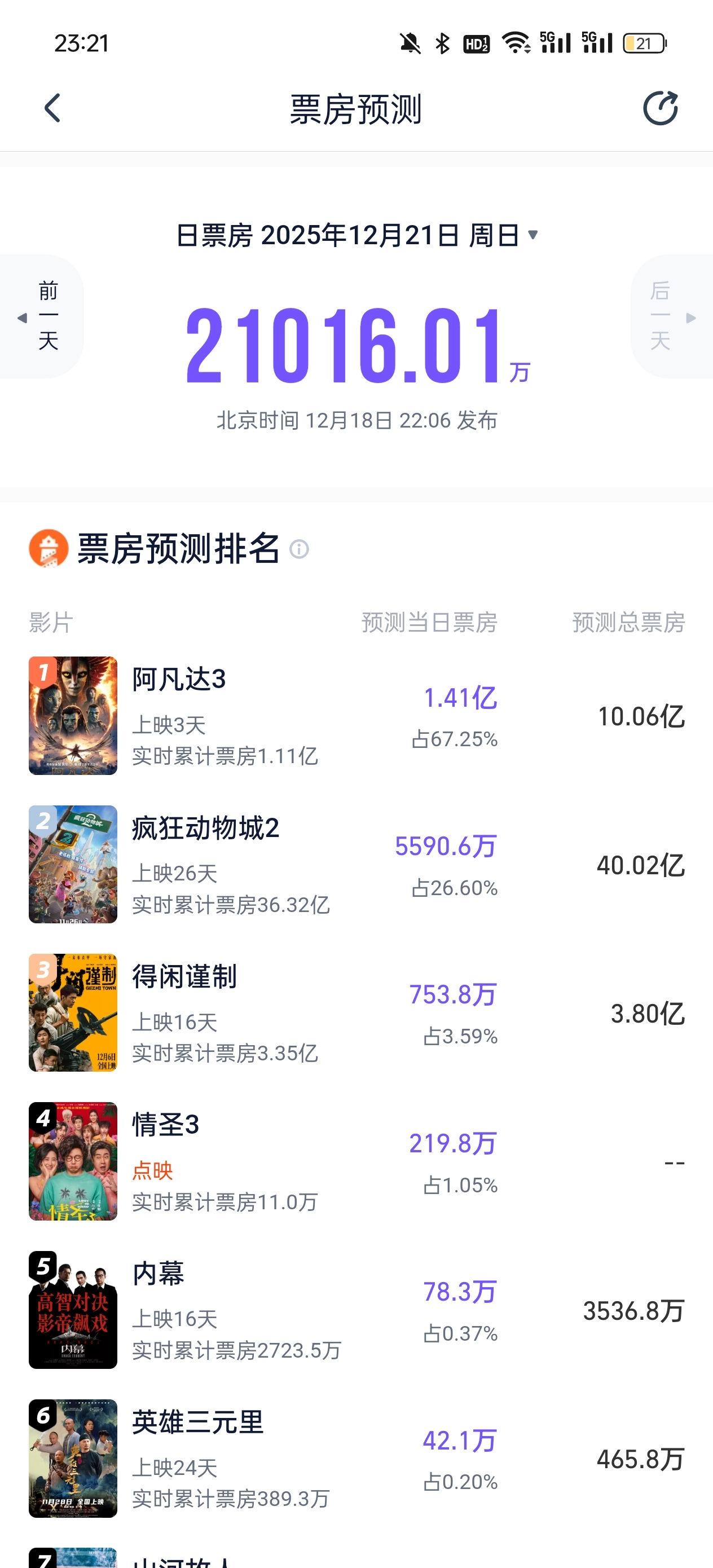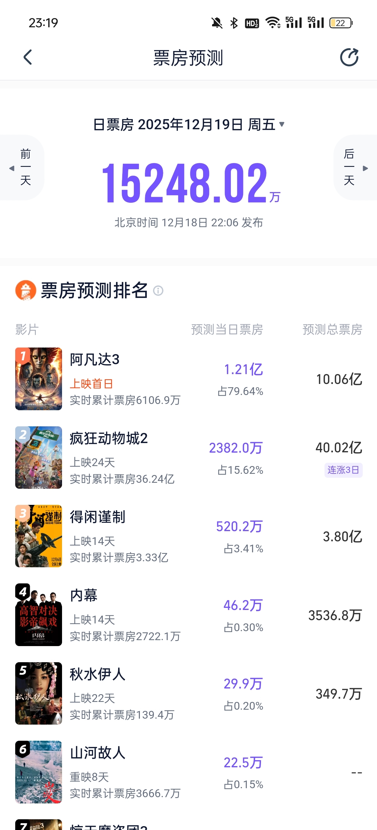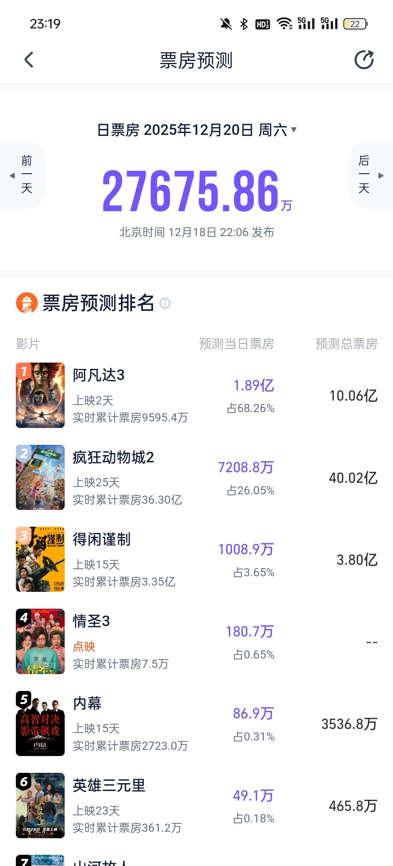 灯塔专业版票房预测,阿凡达3:12.19号1.21亿,12.20号1.89亿,1