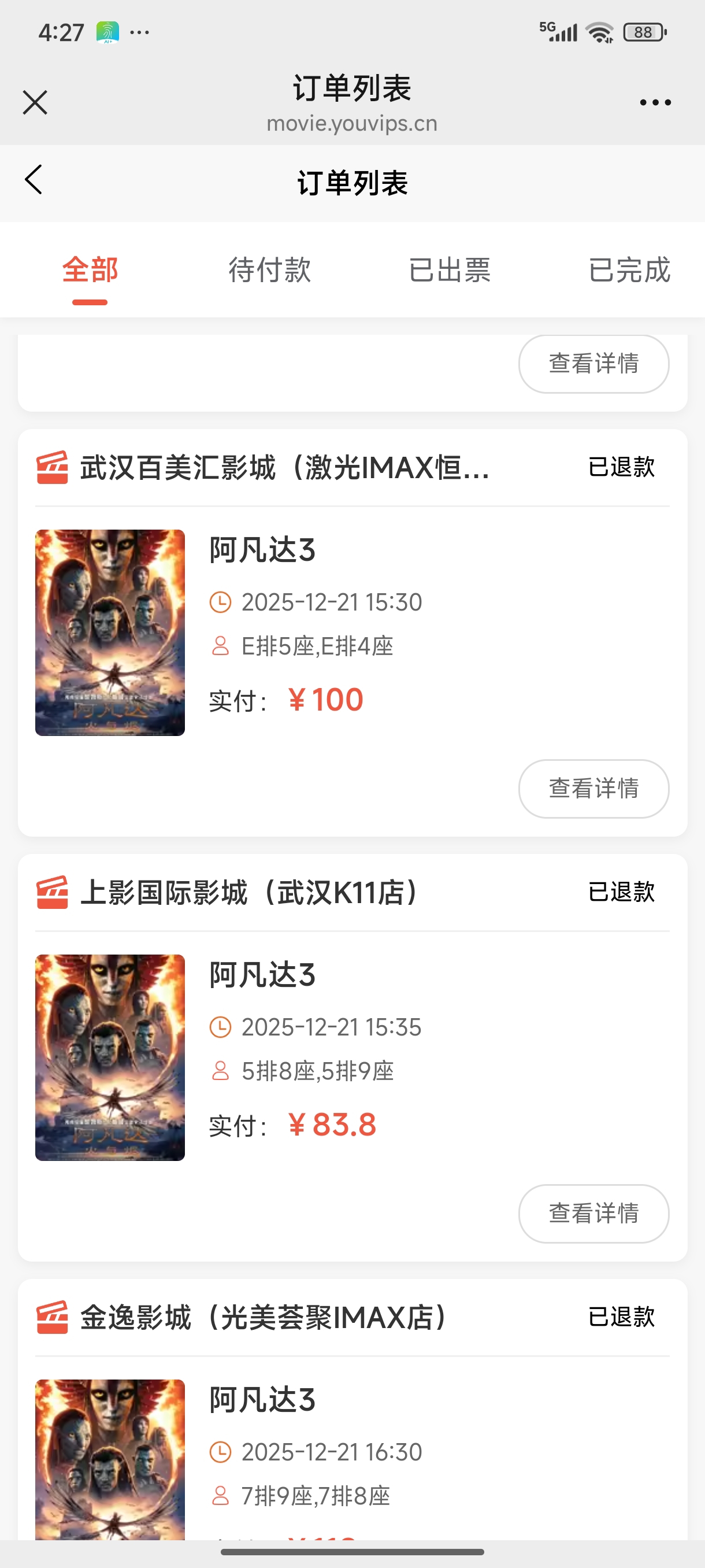 在悦看电影上用会员卡买阿凡达根本买不到,换了四家影院,全被退票。只能迟几天看了。