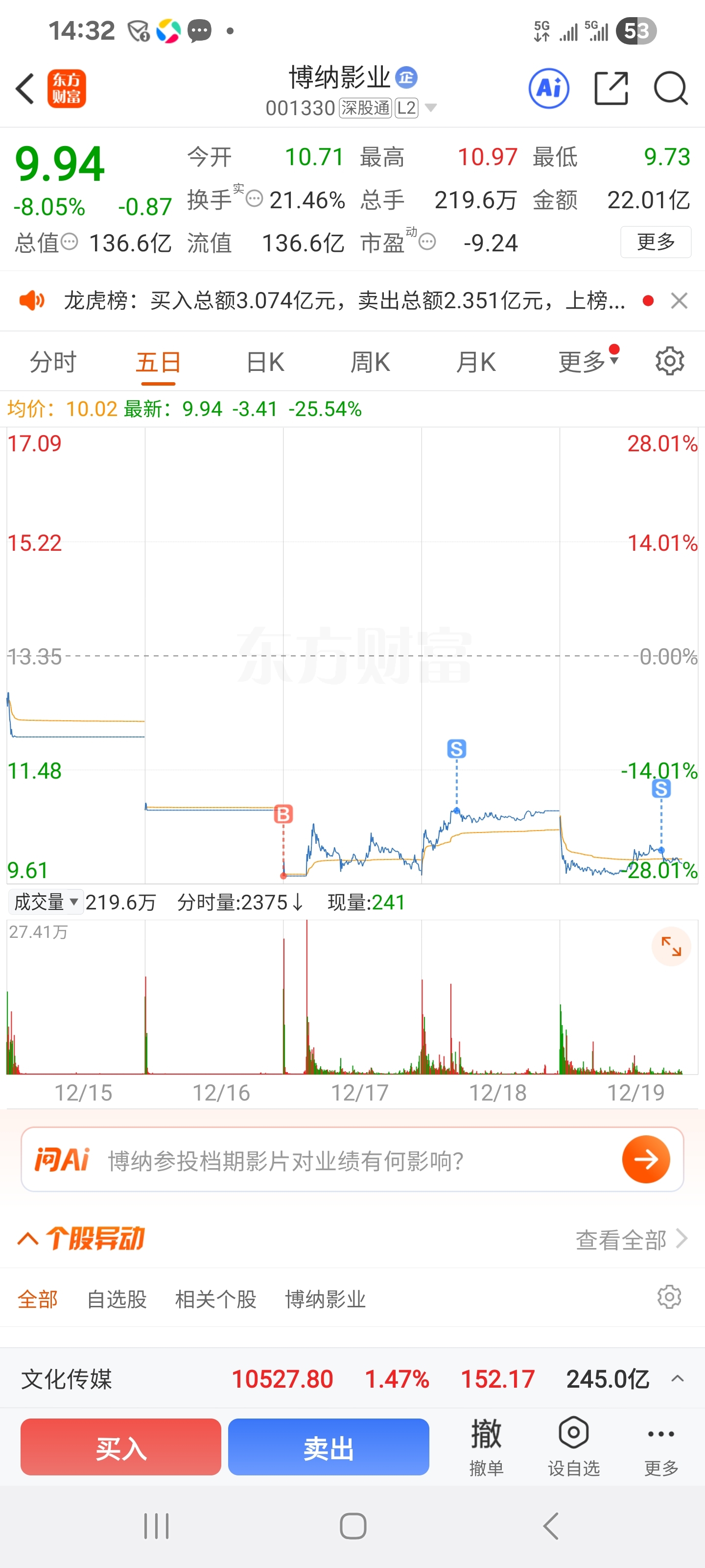 $博纳影业(SZ001330)$ 另外一半筹码砸完了,呵呵呵,我不来了,两天就赚几个点,烂人股