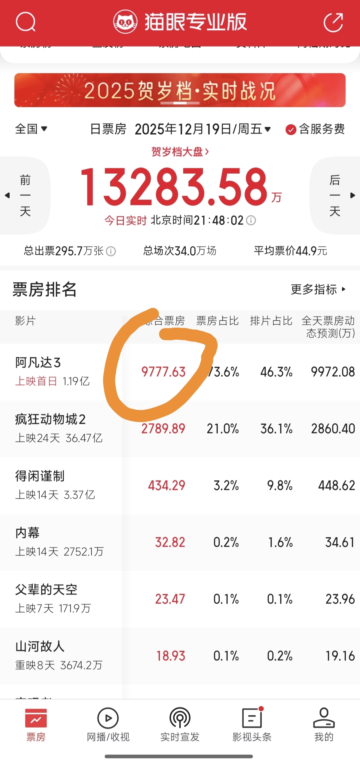 $博纳影业(SZ001330)$ 21:48分 9800万不到 预测1亿不到票房 这票能涨停?这票还唱多 那些说阿凡达3多好看的 市场数据打脸了吧