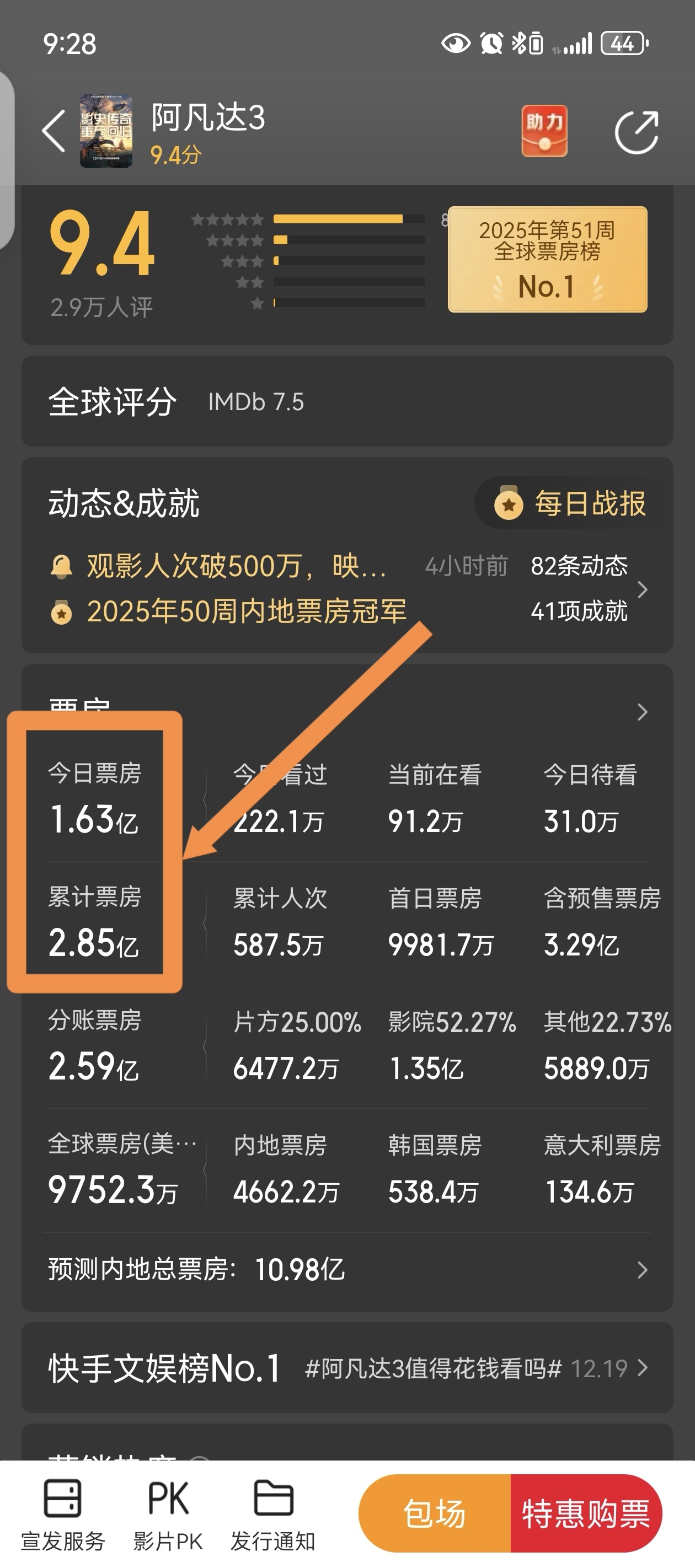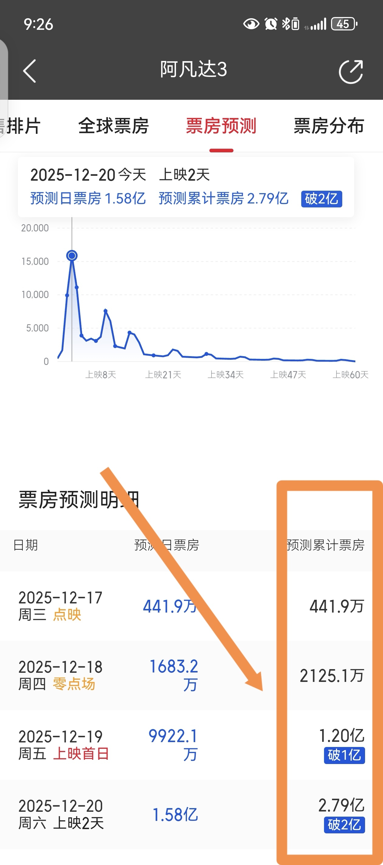 今天票房预期是2.79亿。截止现在晚上9:30分票房已达到2.85亿已经超预期了
