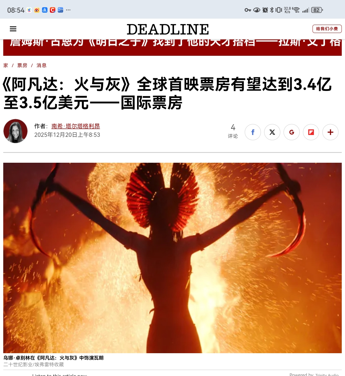 周六更新:詹姆斯·卡梅隆执导的《阿凡达2:火与灰》周五国际票房突破1亿美元大关,三天累计票房达1.004亿美元。目前预计全球首周末票房将在3.4亿至3.5亿美元之间。这一全球票房成绩在周末前预测的范围内,但略低于预期。纳美人(阿凡达的昵称)通常需要一段时间才能真正展现票房实力,随着假期临近,该片在国内外的口碑都十分强劲。