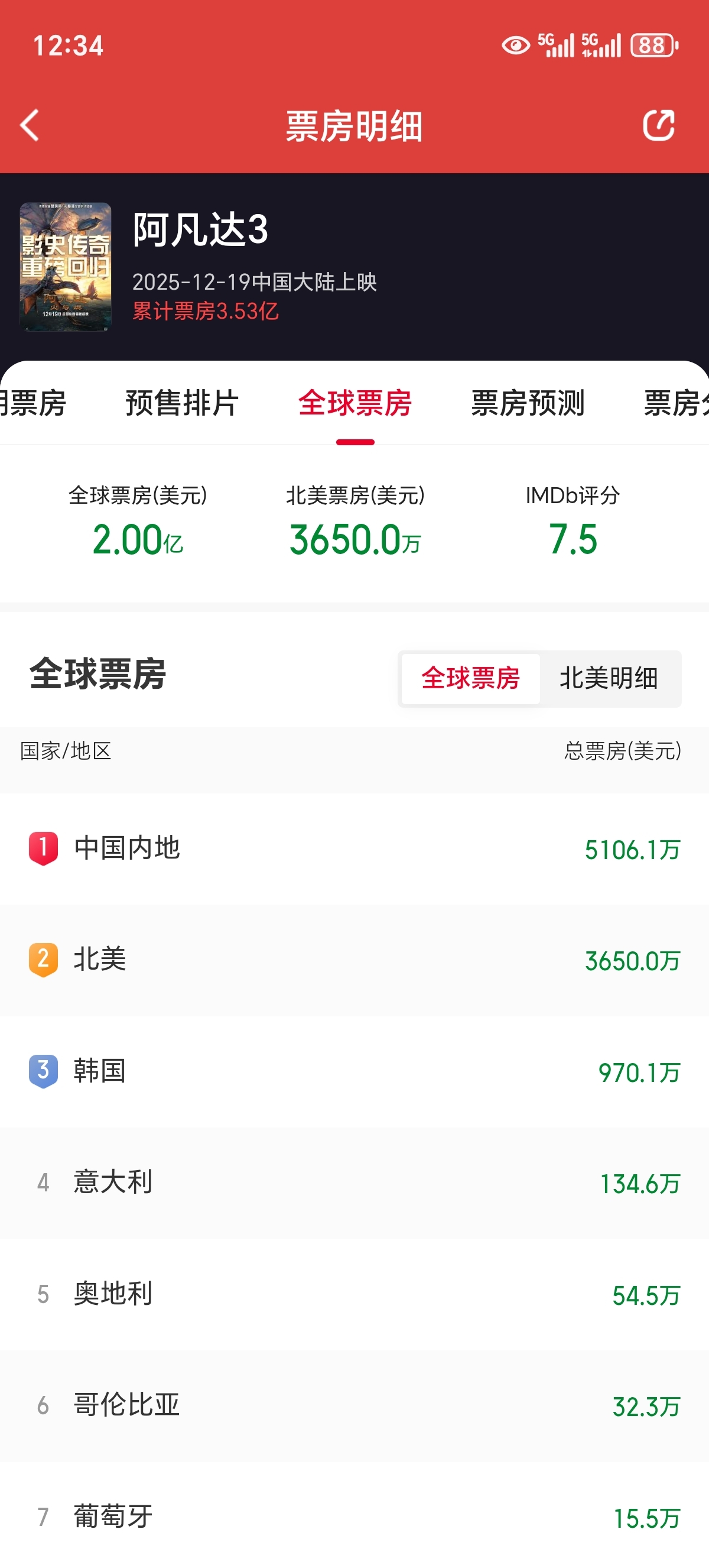 12:34恭喜阿凡达3全球票房突破2亿美元,国内票房突破5000万美元!