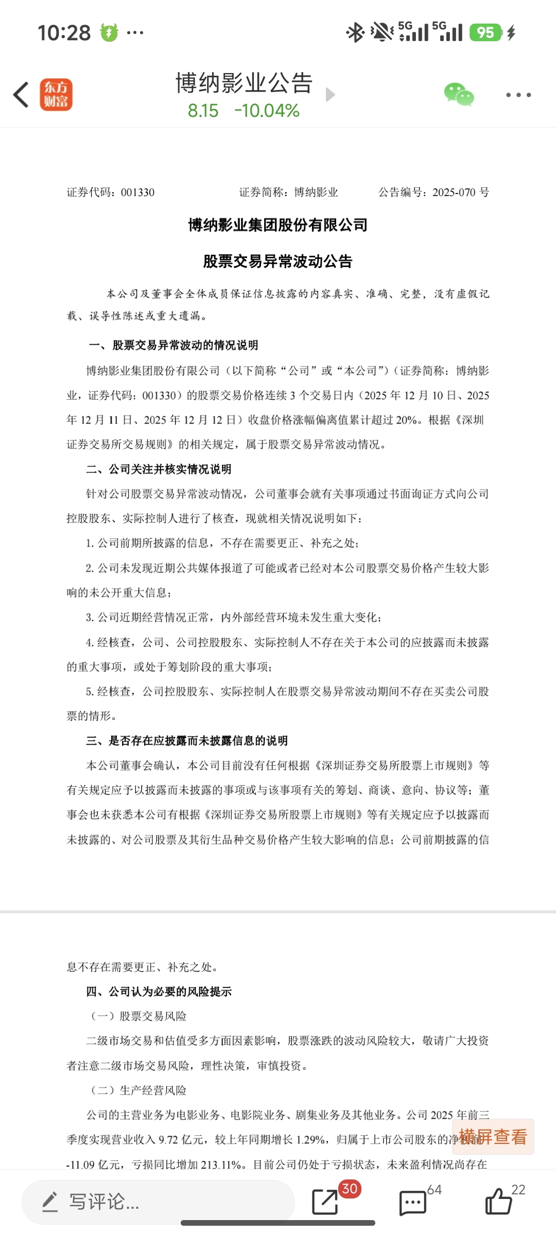 $博纳影业(SZ001330)$ 别人在12号的时候就提示风险了,现在在这儿说要举报,合着又想要高收益又不想承担高风险,一群小丑