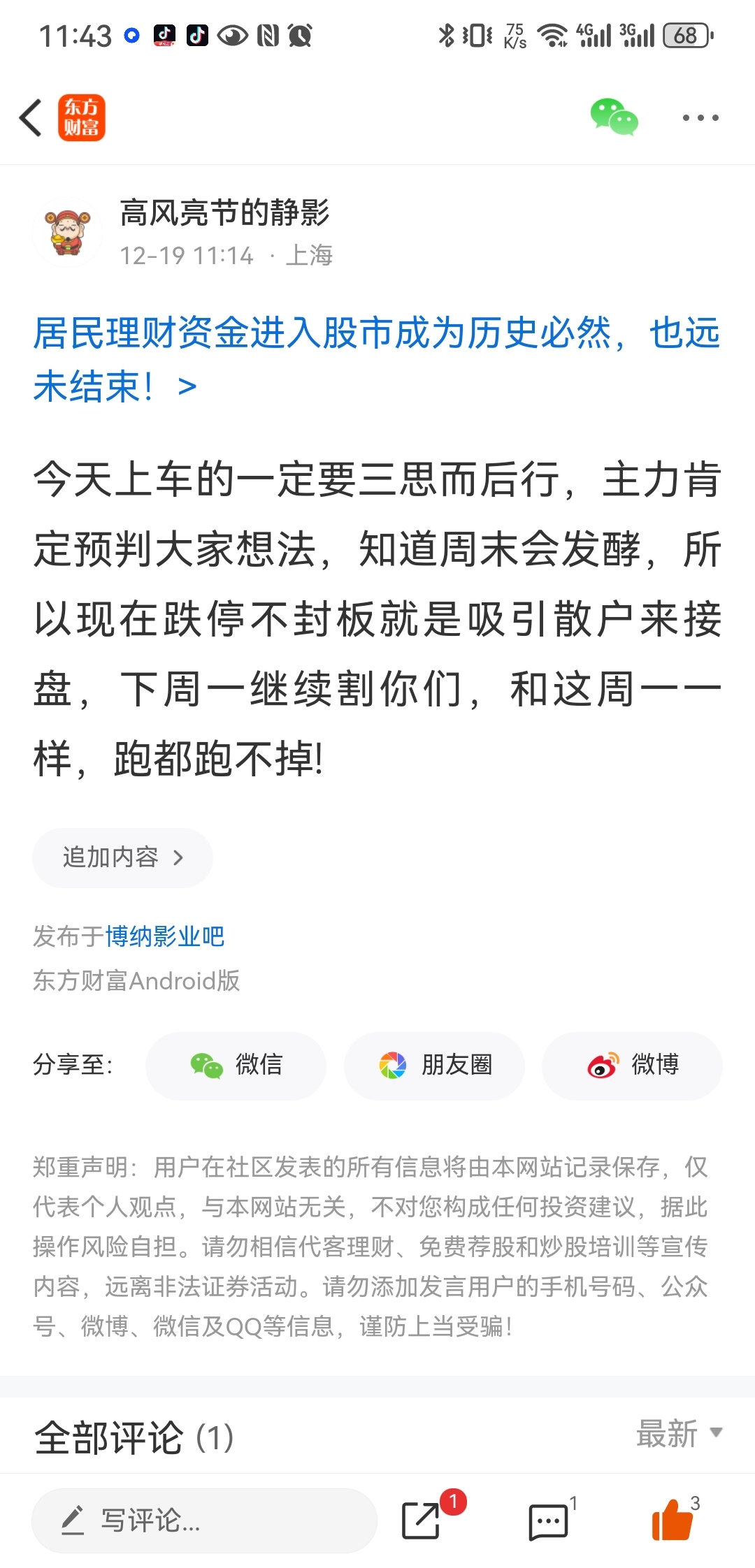 温馨提示: 1.根据《证券法》规定,禁止编造、传播虚假信息或者误导性信息,扰乱证券市场;2.用户在本社区发表的所有资料、言论等仅代表个人观点,与本网站立场无关,不对您构成任何投资建议。用户应基于自己的独立判断,自行决定证券投资并承担相应风险。《东方财富社区管理规定》