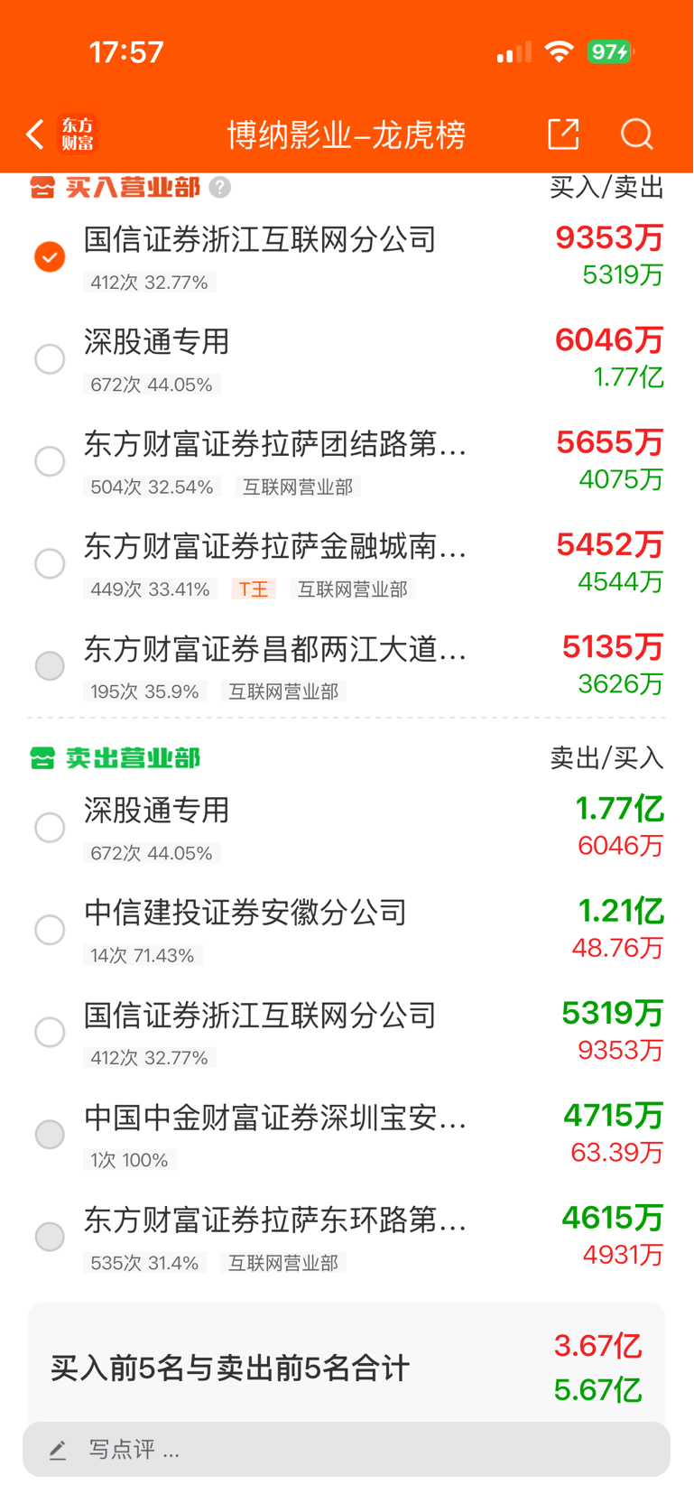 $博纳影业(SZ001330)$ 12月17号龙虎榜