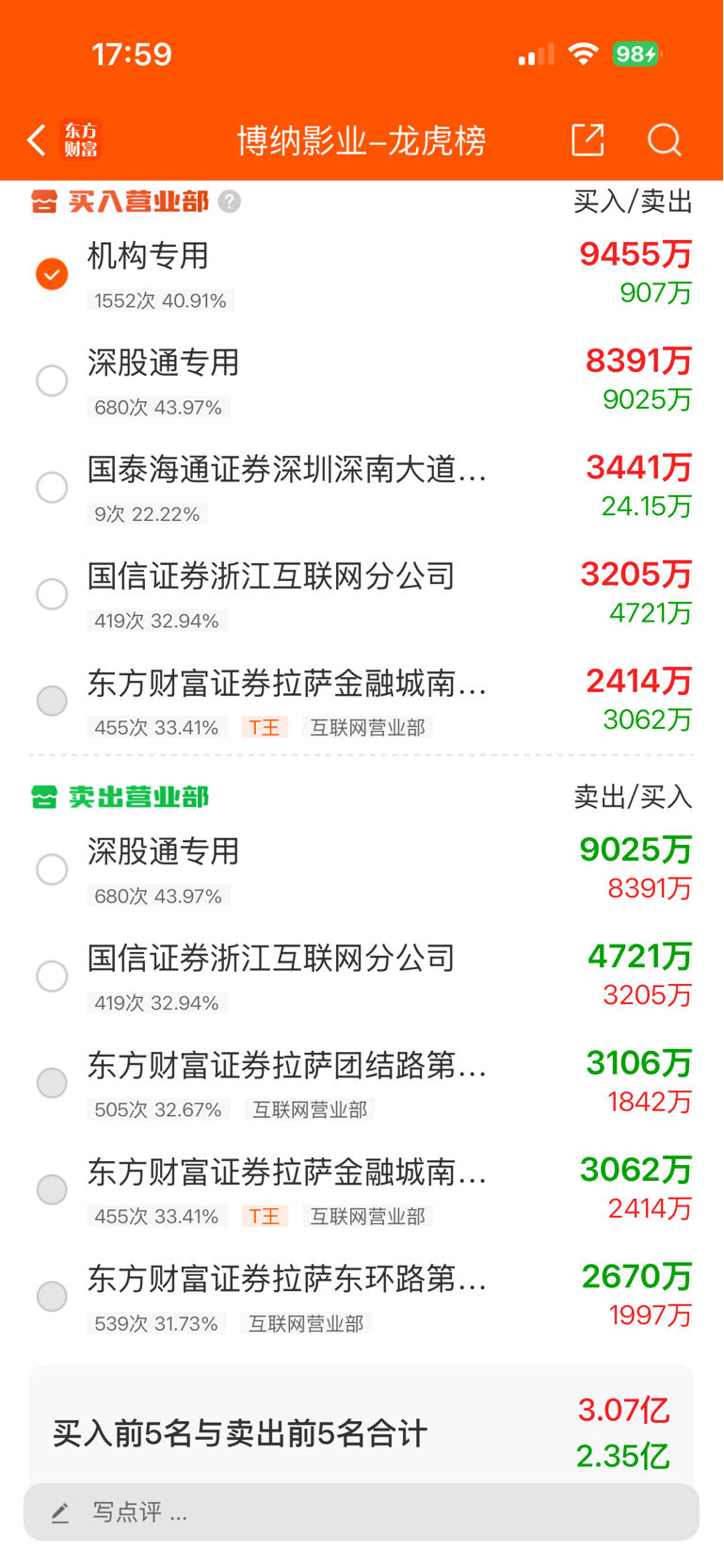 $博纳影业(SZ001330)$ 12月18号龙虎榜