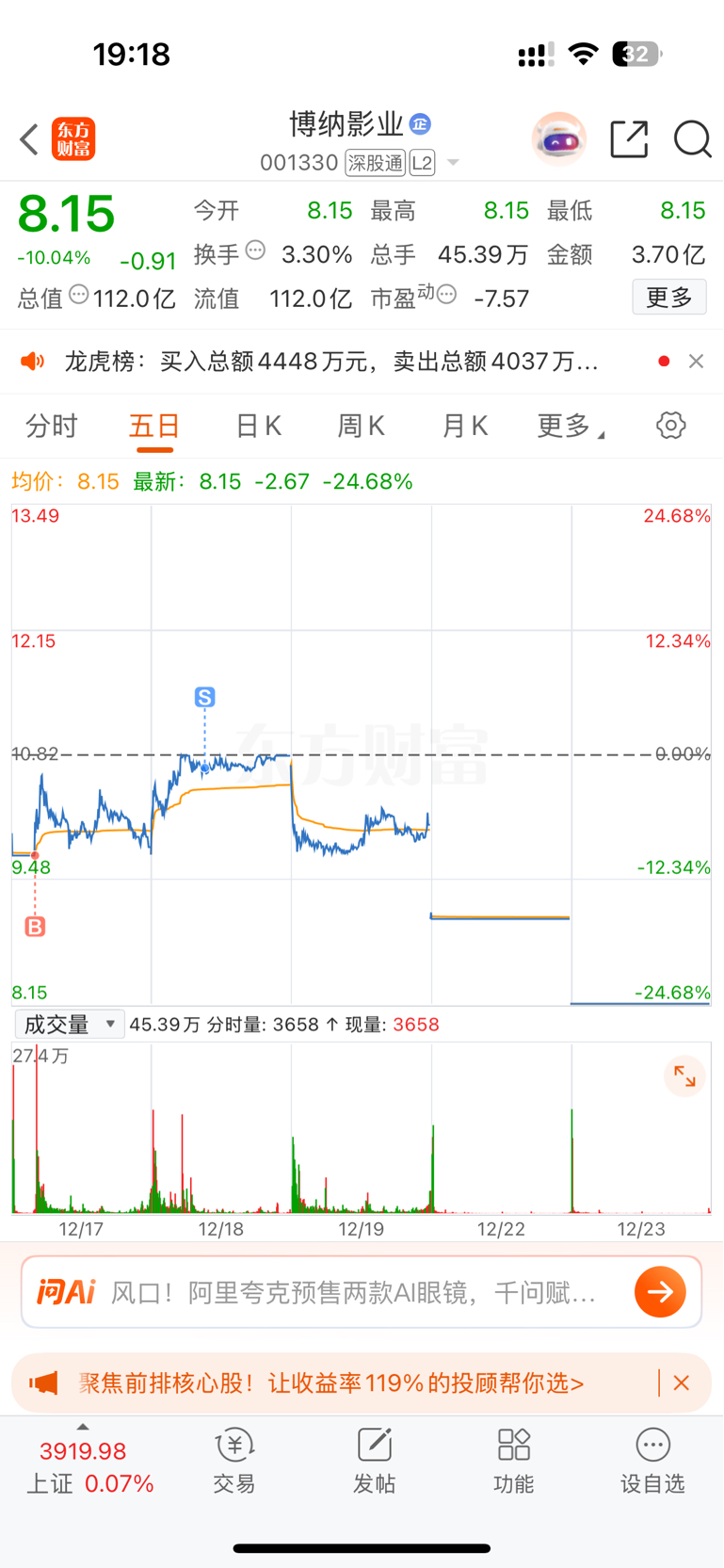 $博纳影业(SZ001330)$ 买了100万,挣了10万。幸好跑的快,要不然都没得吃
