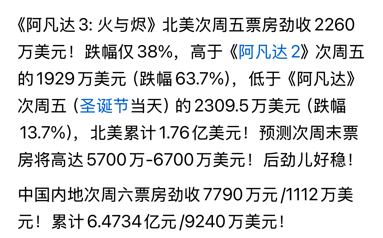 《阿凡达3》北美次周五票房劲收2260万美元!国内国外都能打